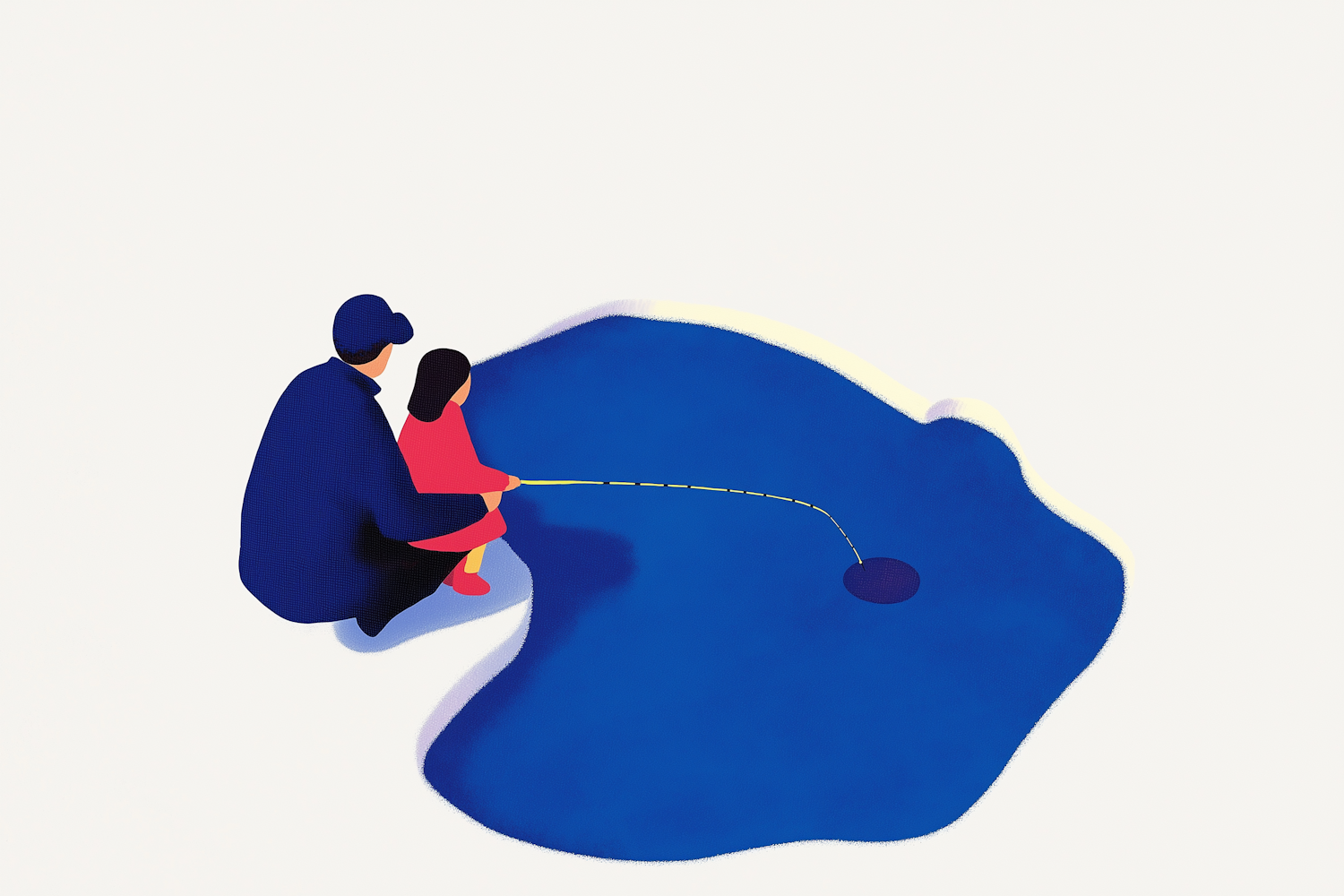 Minimalist illustration of a father and daughter ice fishing, with bold colors and simple design, highlighting their bonding moment.