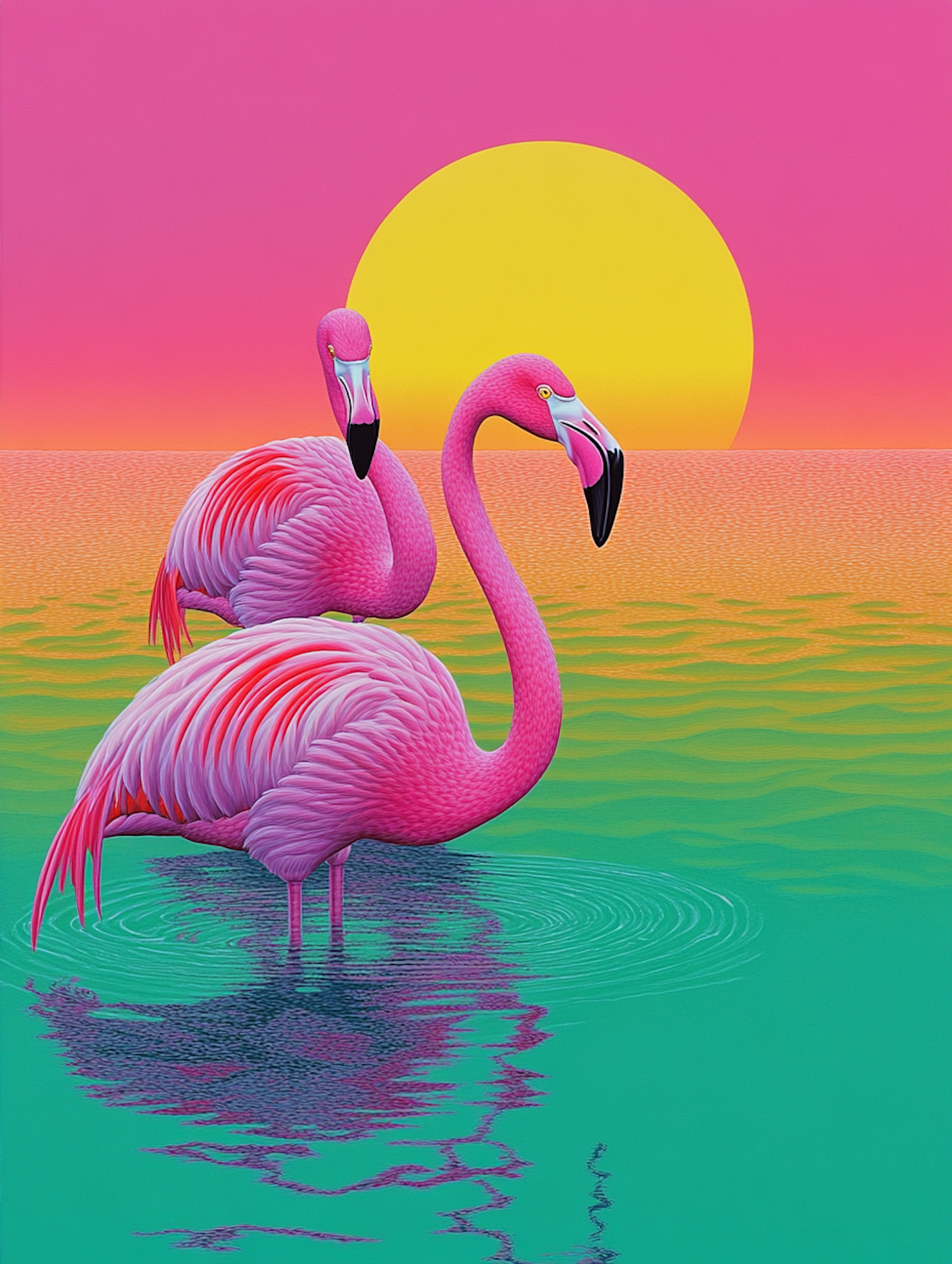 Vibrant pink flamingos in turquoise water with a stunning yellow sun and pink-orange sky, creating a surreal and serene scene.