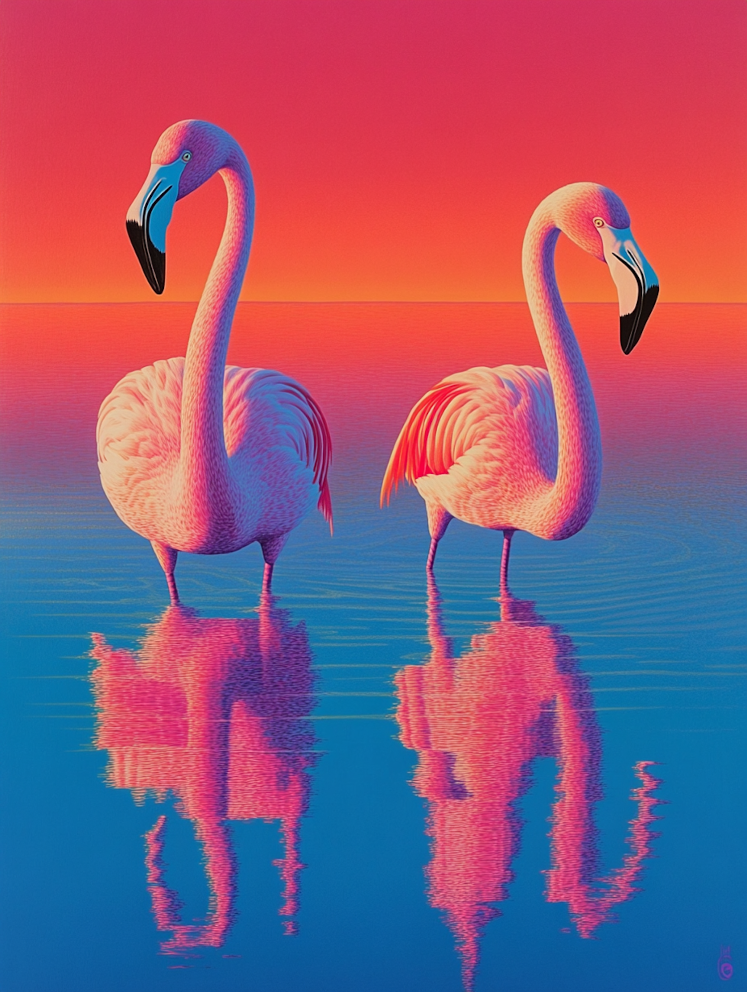 Vibrant flamingos stand in serene water, reflecting a stunning sunset sky. Perfect symmetry and vivid colors create a tranquil scene.
