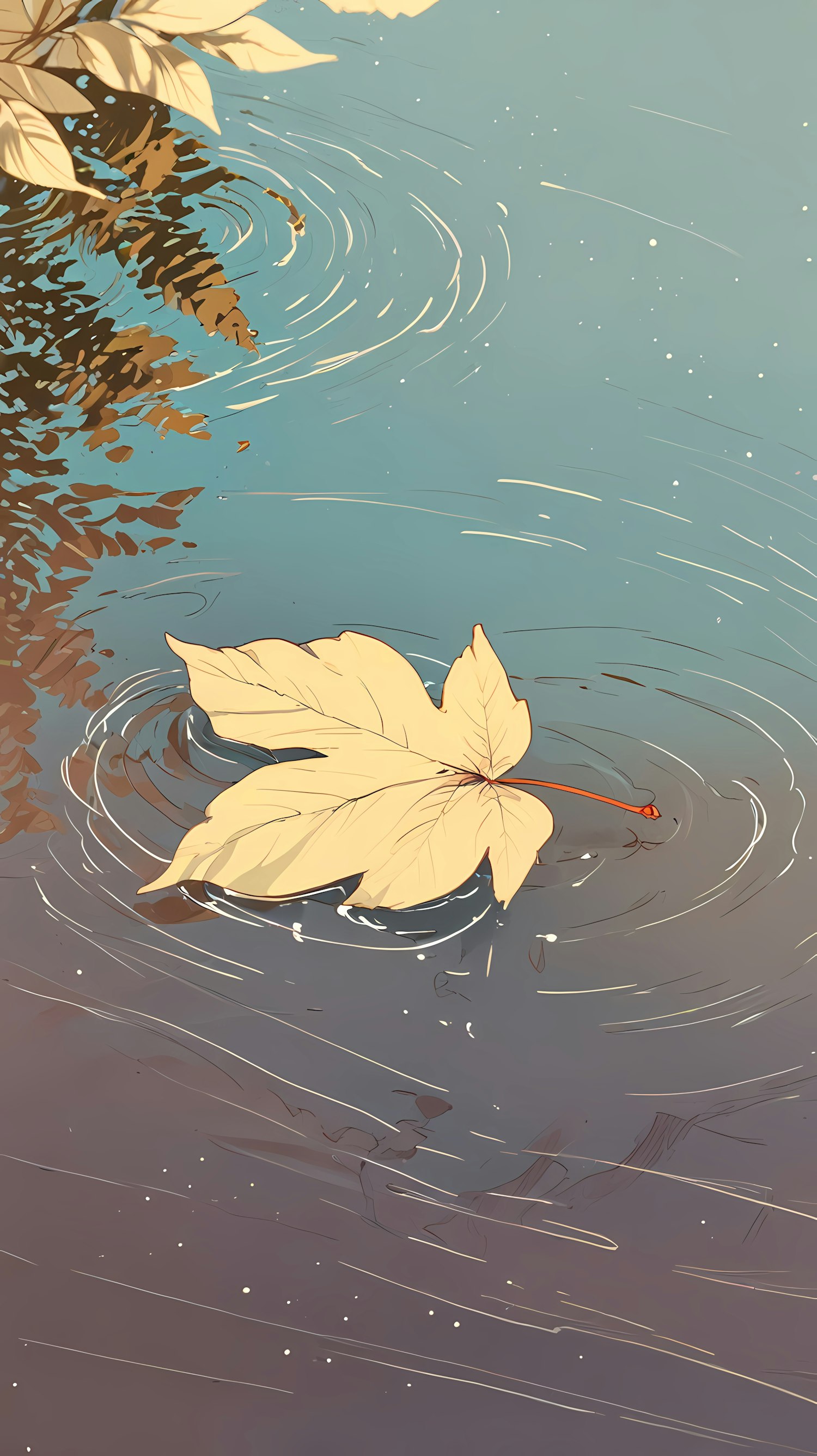 A tranquil illustration of a pale yellow leaf floating on rippled blue water, with reflections adding depth and calmness.