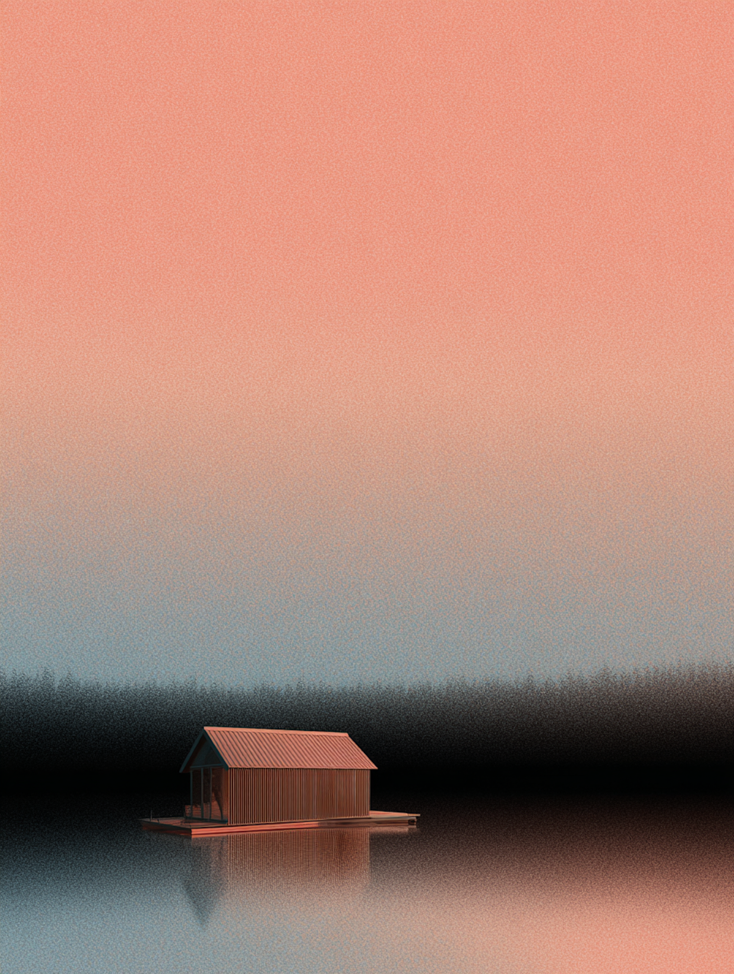 A tranquil floating cabin on calm waters, set against a gradient sky transitioning from pink to dark, with a forest silhouette in the distance.