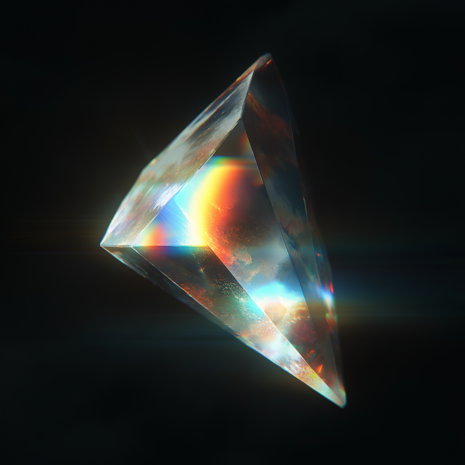 A glowing crystal prism refracts light into a vivid rainbow against a dark background, creating a mesmerizing and ethereal visual effect.