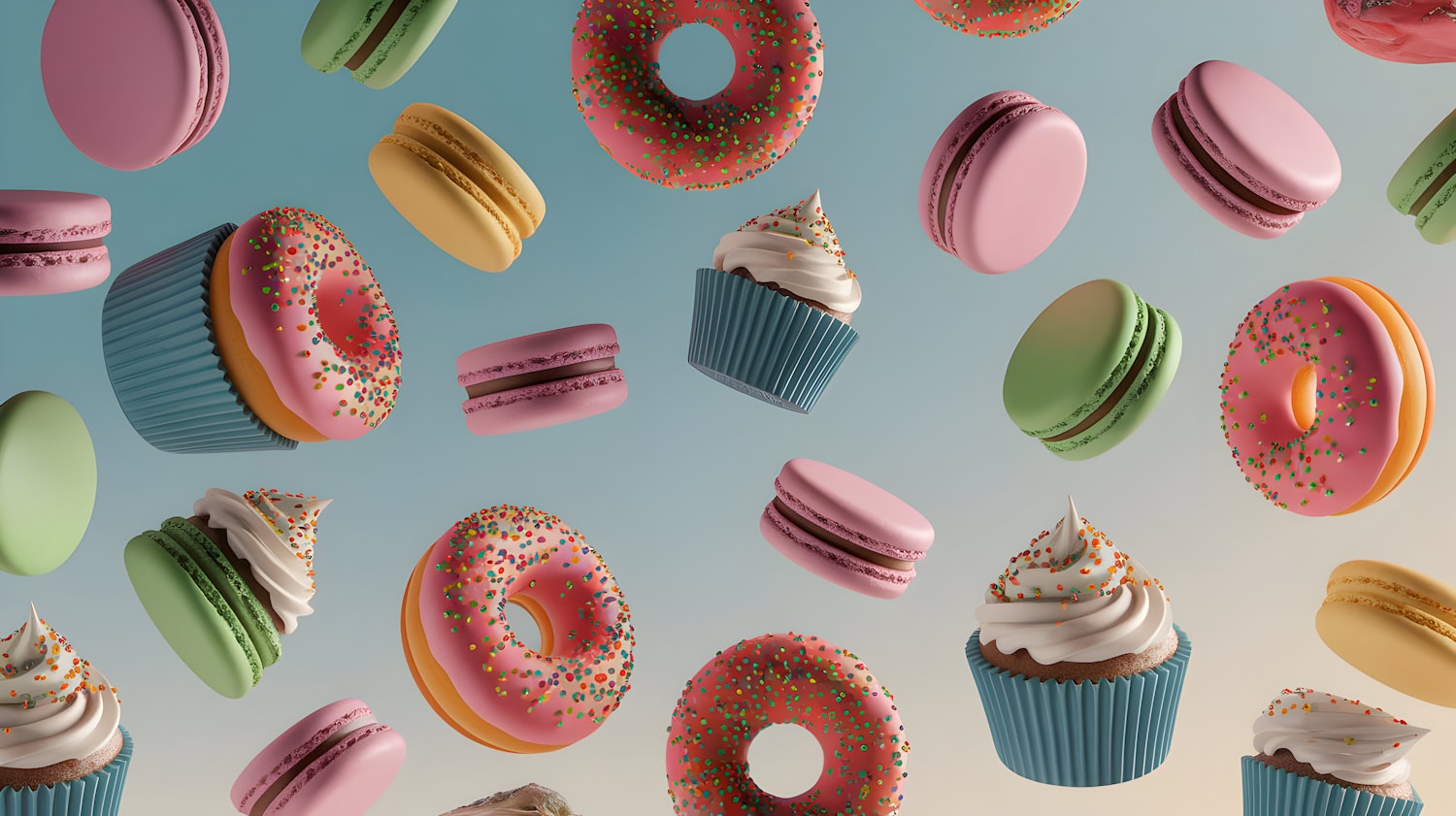 Floating pastel macarons, frosted donuts, and cupcakes with sprinkles create a dreamy dessert scene against a soft gradient sky.