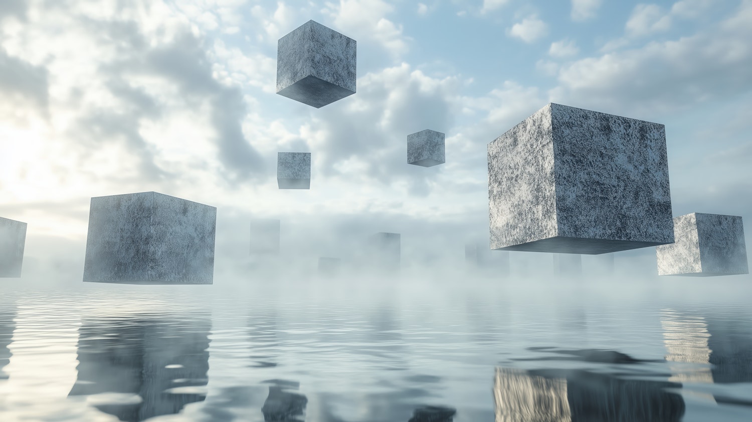 Floating gray cubes hover over a misty, reflective water surface under a soft, cloudy sky, creating a surreal and tranquil scene.