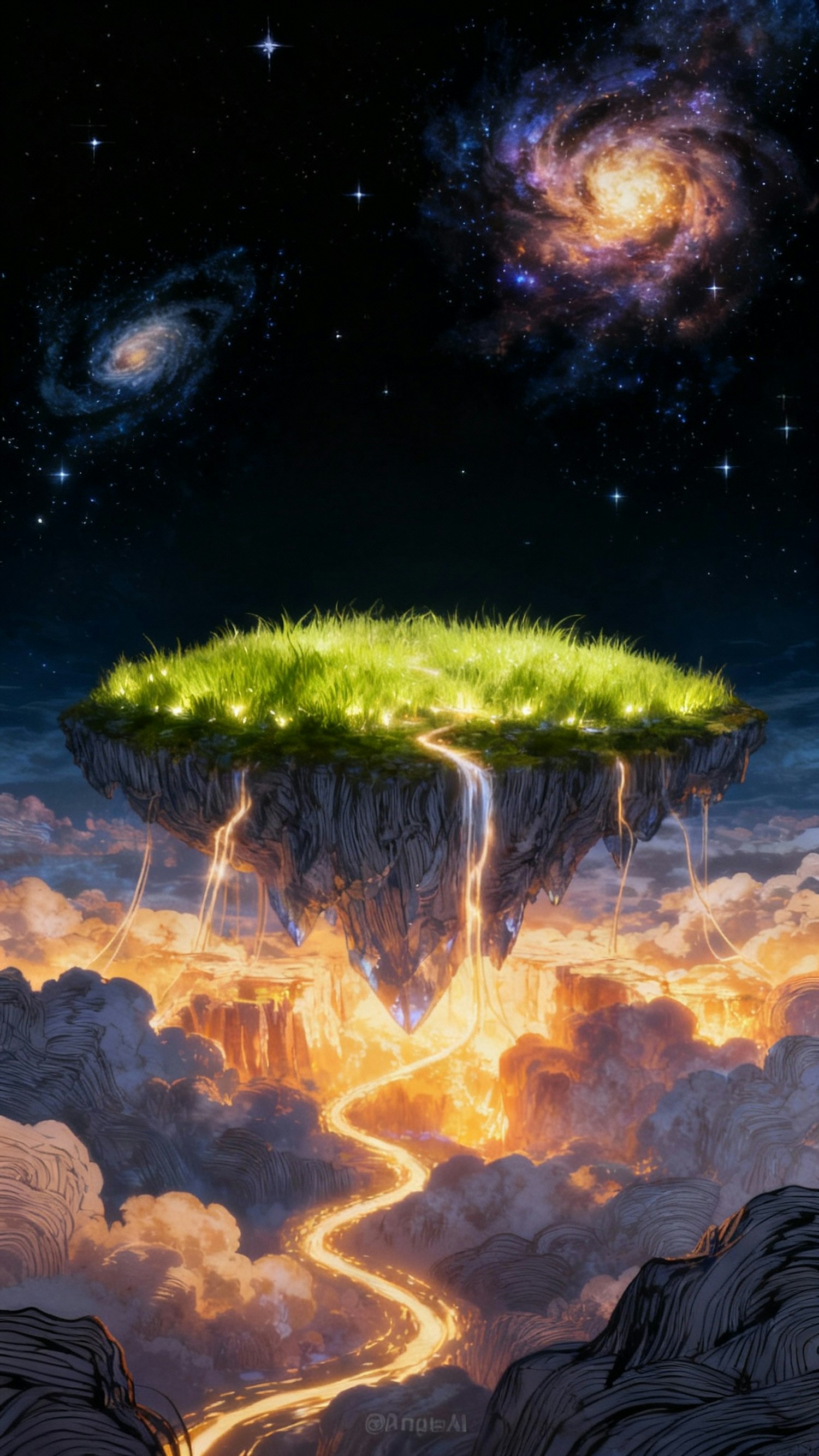 A floating island with glowing grass, cascading light, and a cosmic backdrop of galaxies and stars in a surreal fantasy setting.