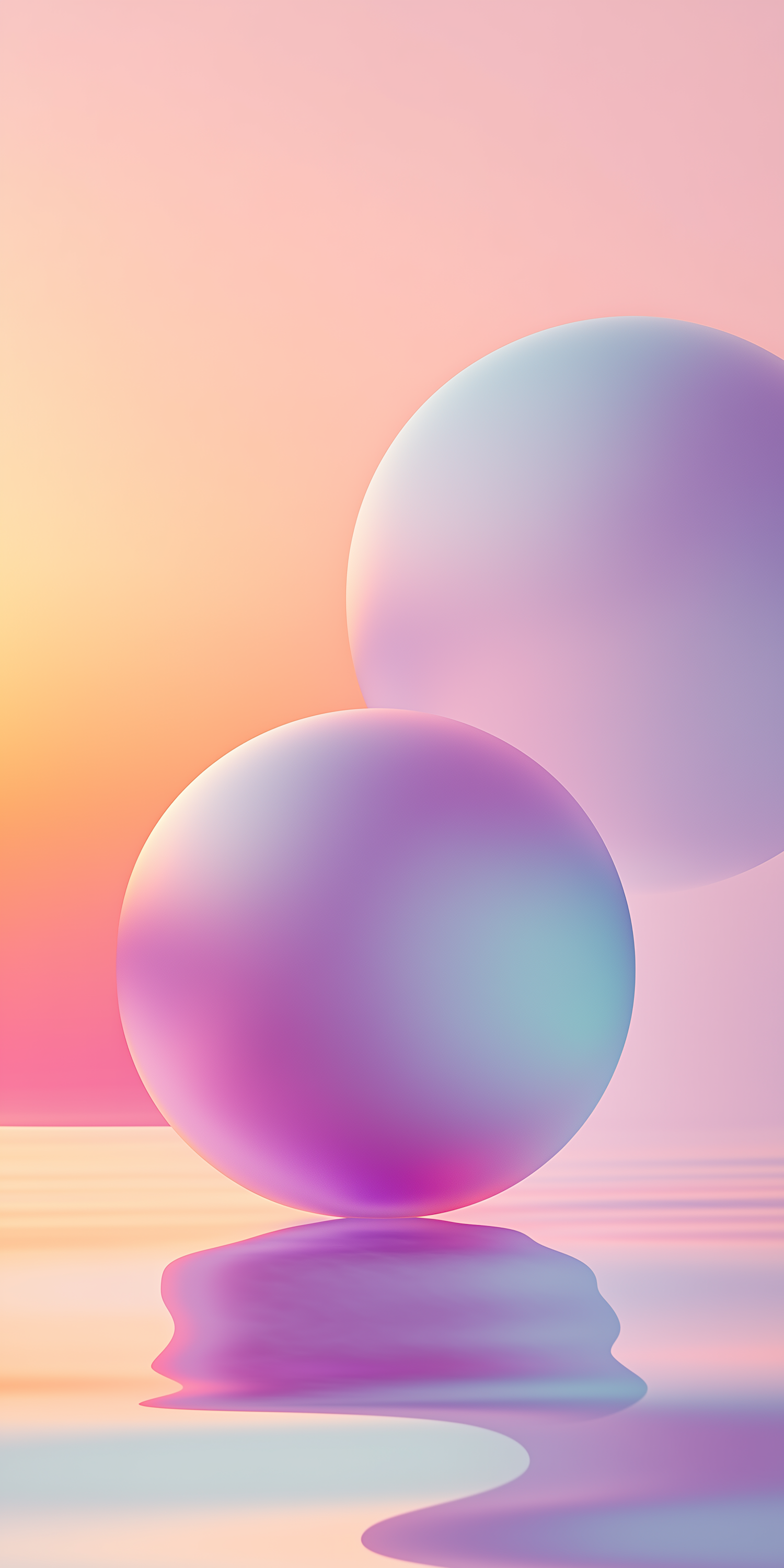 Dreamy pastel spheres floating above a reflective surface with soft gradients of pink, purple, and orange in the background.