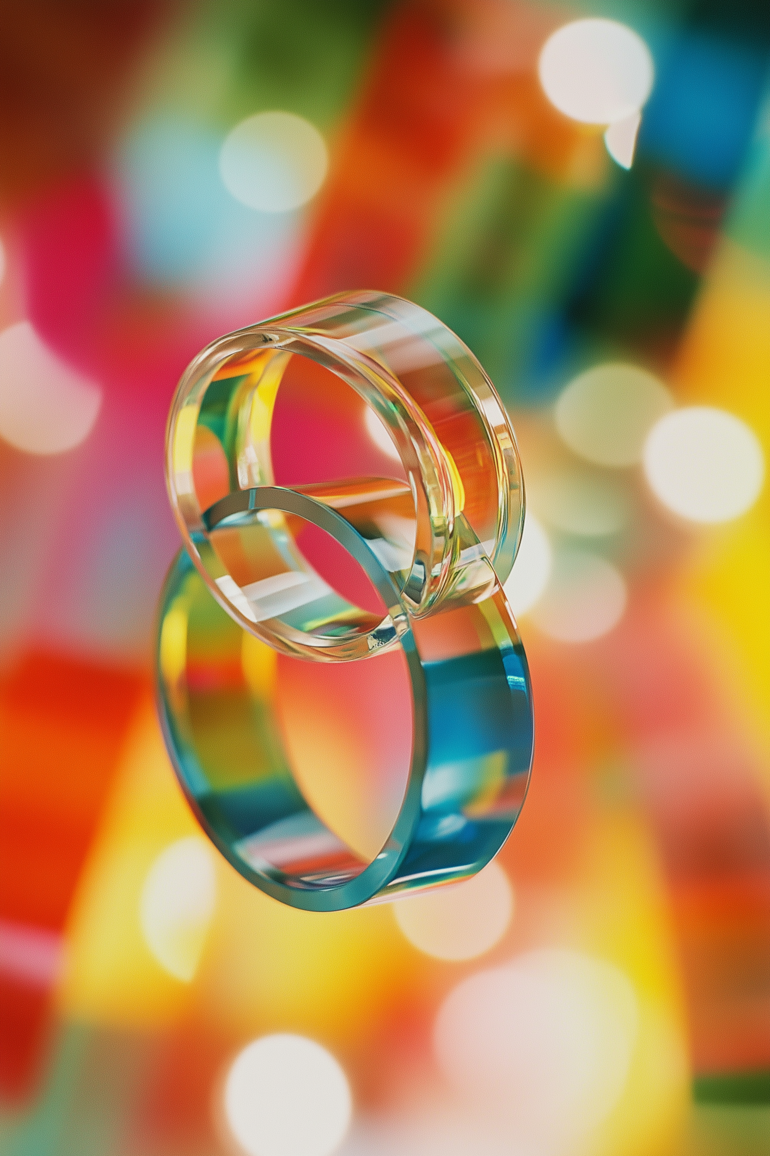 Two transparent rings reflect vibrant colors against a blurred bokeh background, creating a dreamy and abstract visual.