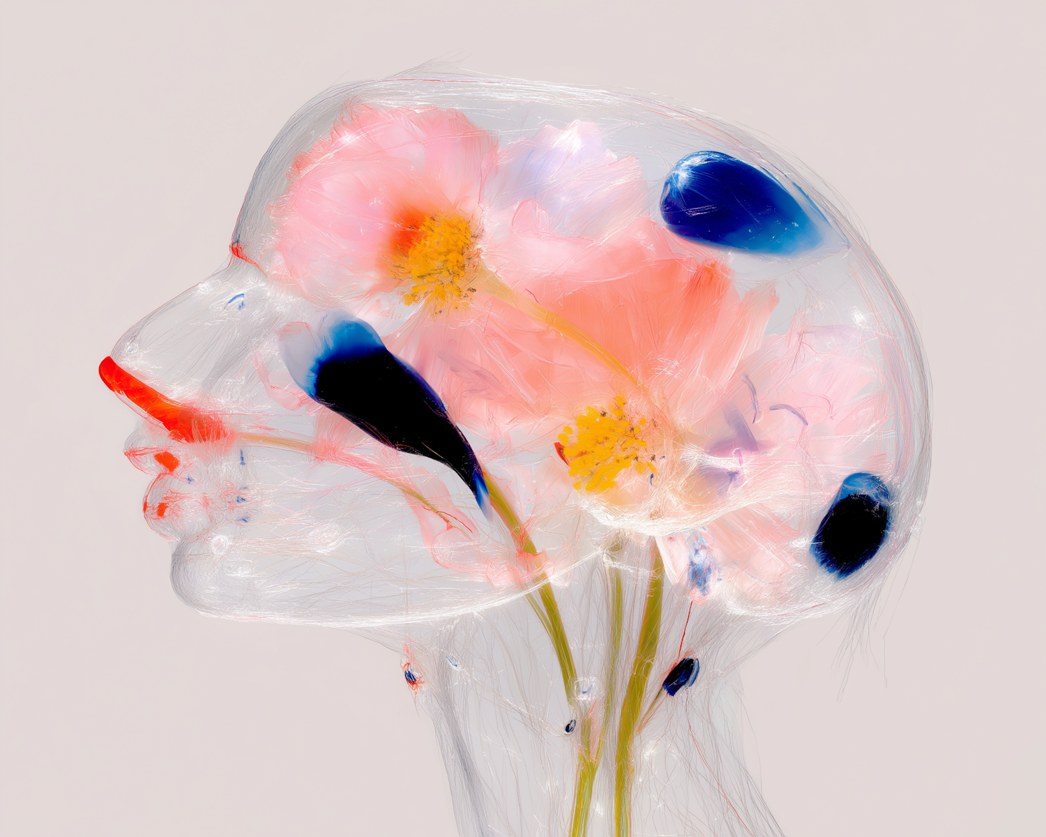 A surreal illustration of a translucent human profile filled with vibrant flowers and abstract shapes, blending natural and artistic elements.