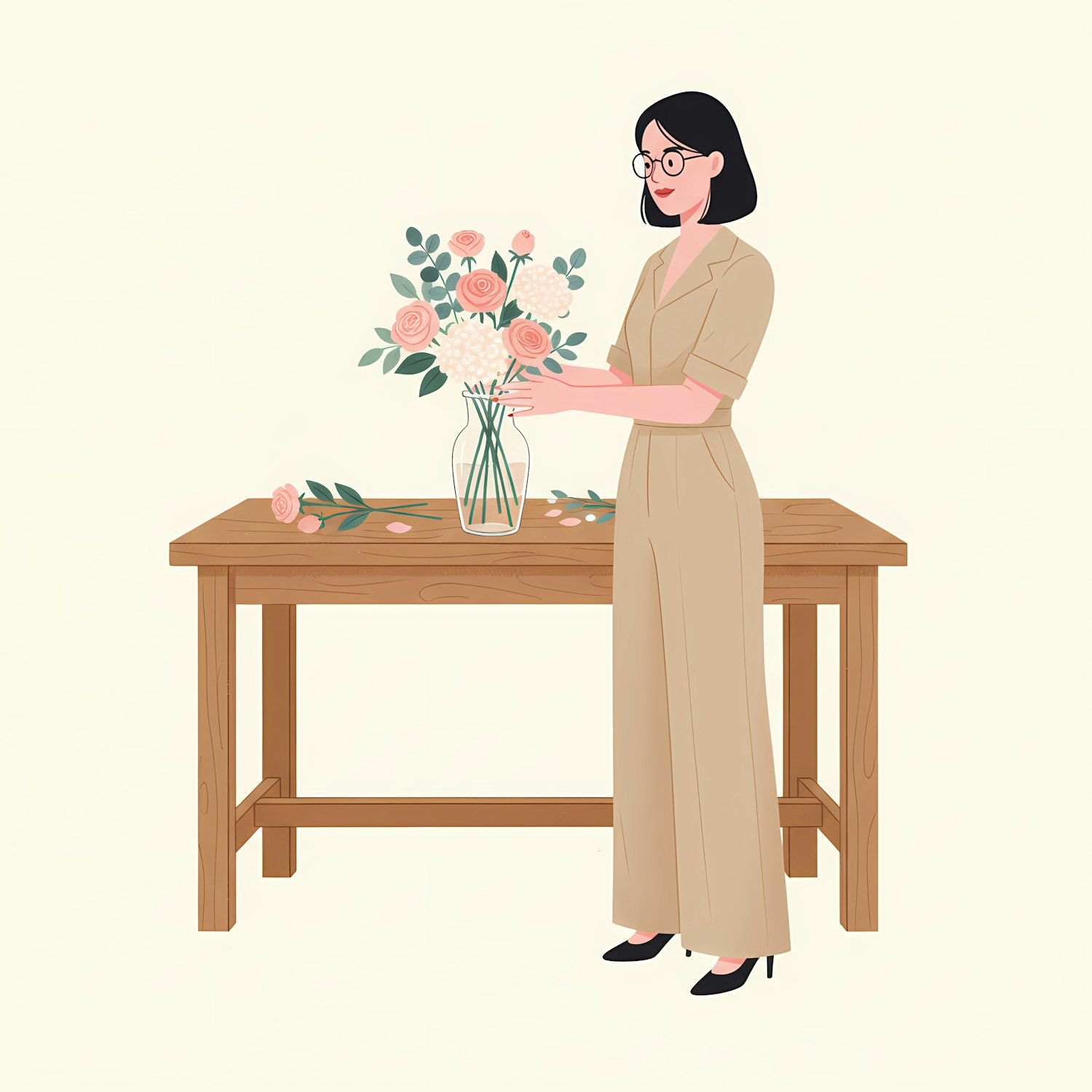 A woman arranges a bouquet of pink roses and white hydrangeas in a vase on a wooden table, wearing a beige jumpsuit and glasses.