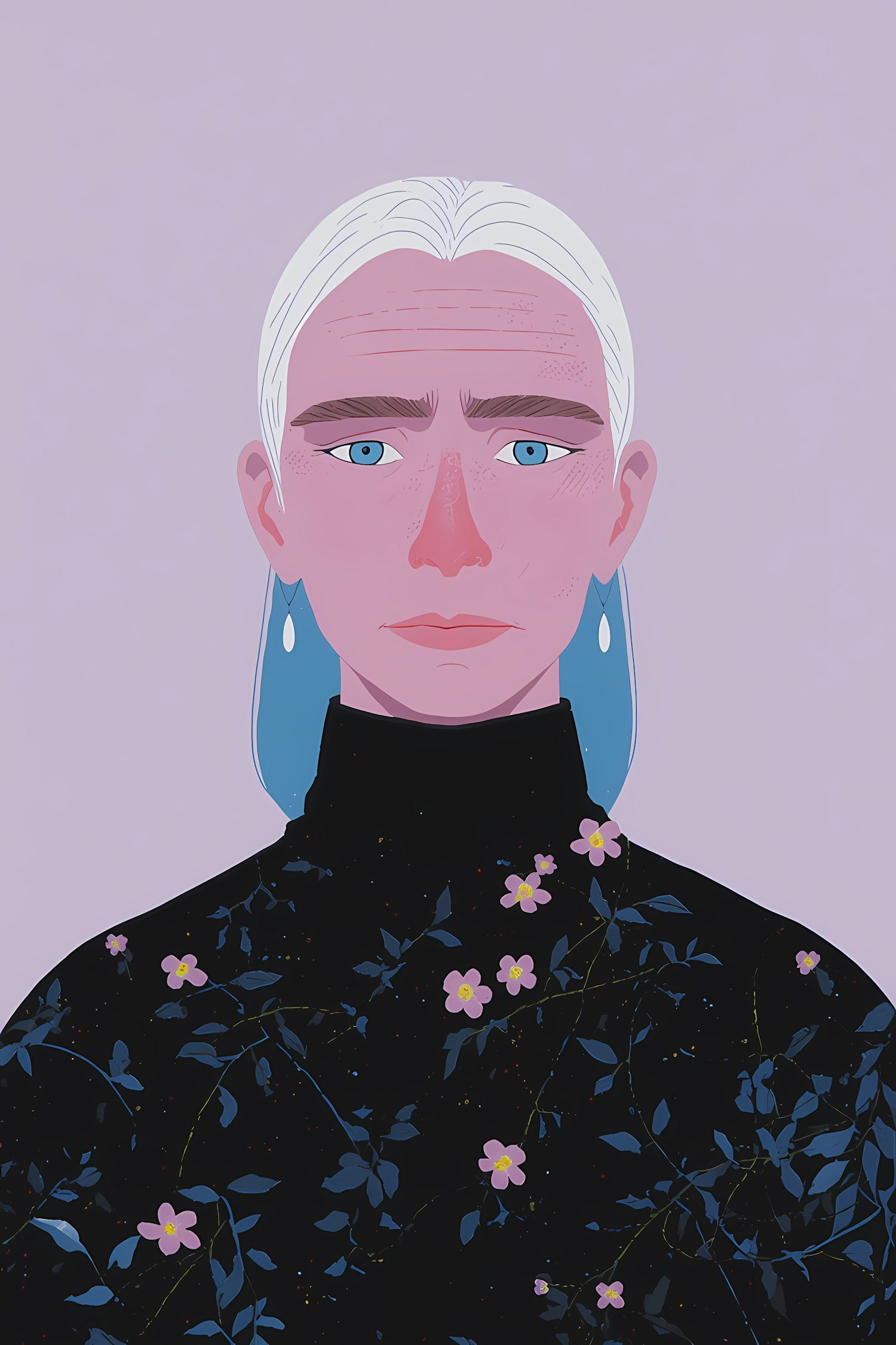 Stylized portrait of a person with white hair, blue eyes, and floral-patterned clothing against a lavender background.
