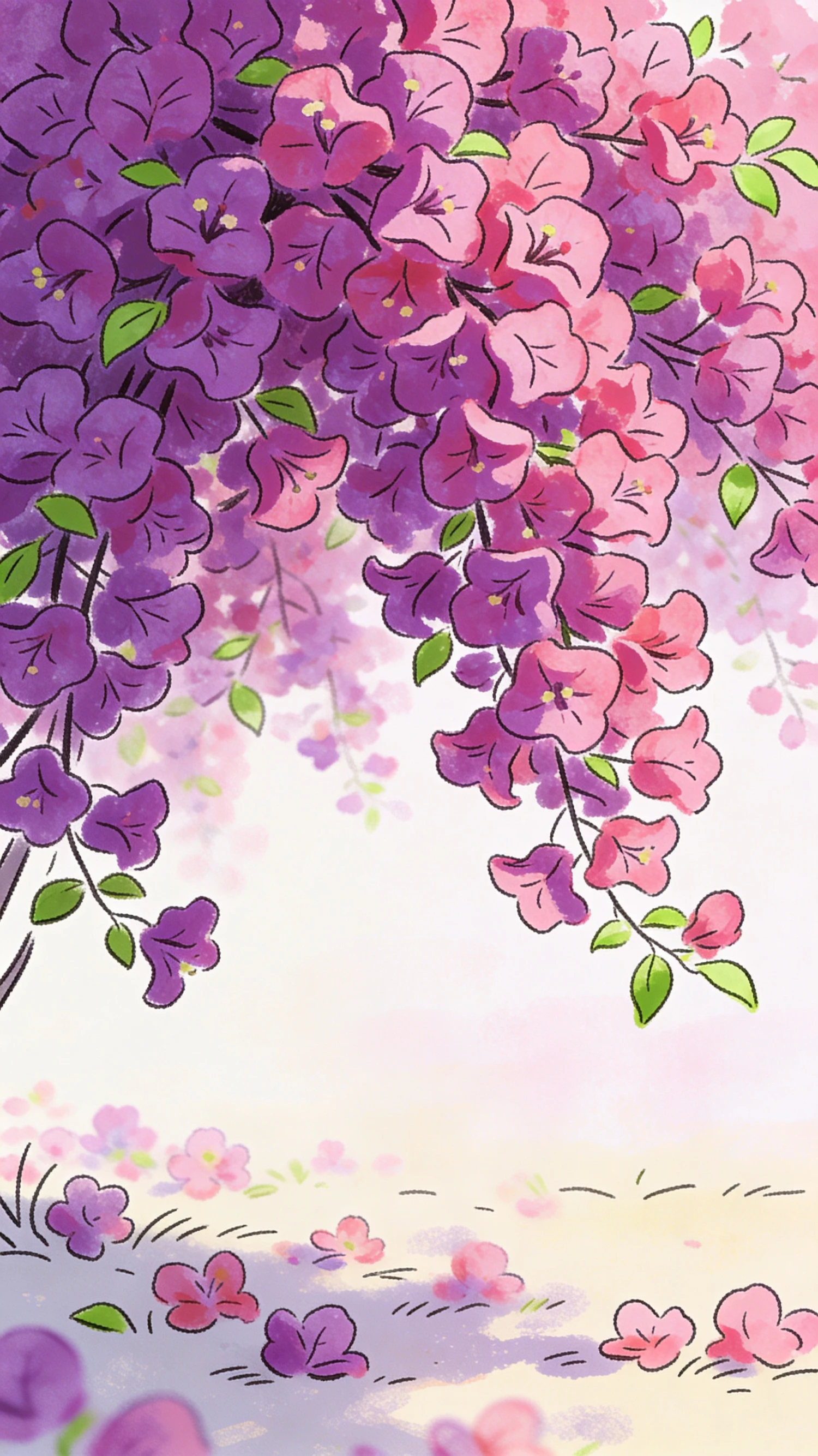A colorful illustration of purple and pink flowers with green leaves, creating a serene and artistic floral scene.