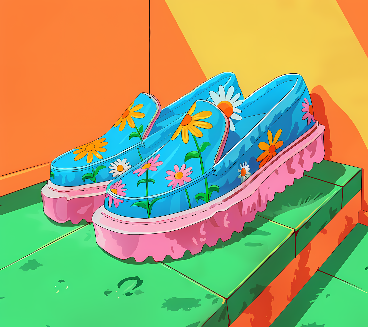 Vibrant floral slip-on shoes with pink soles on green steps against an orange and yellow background.