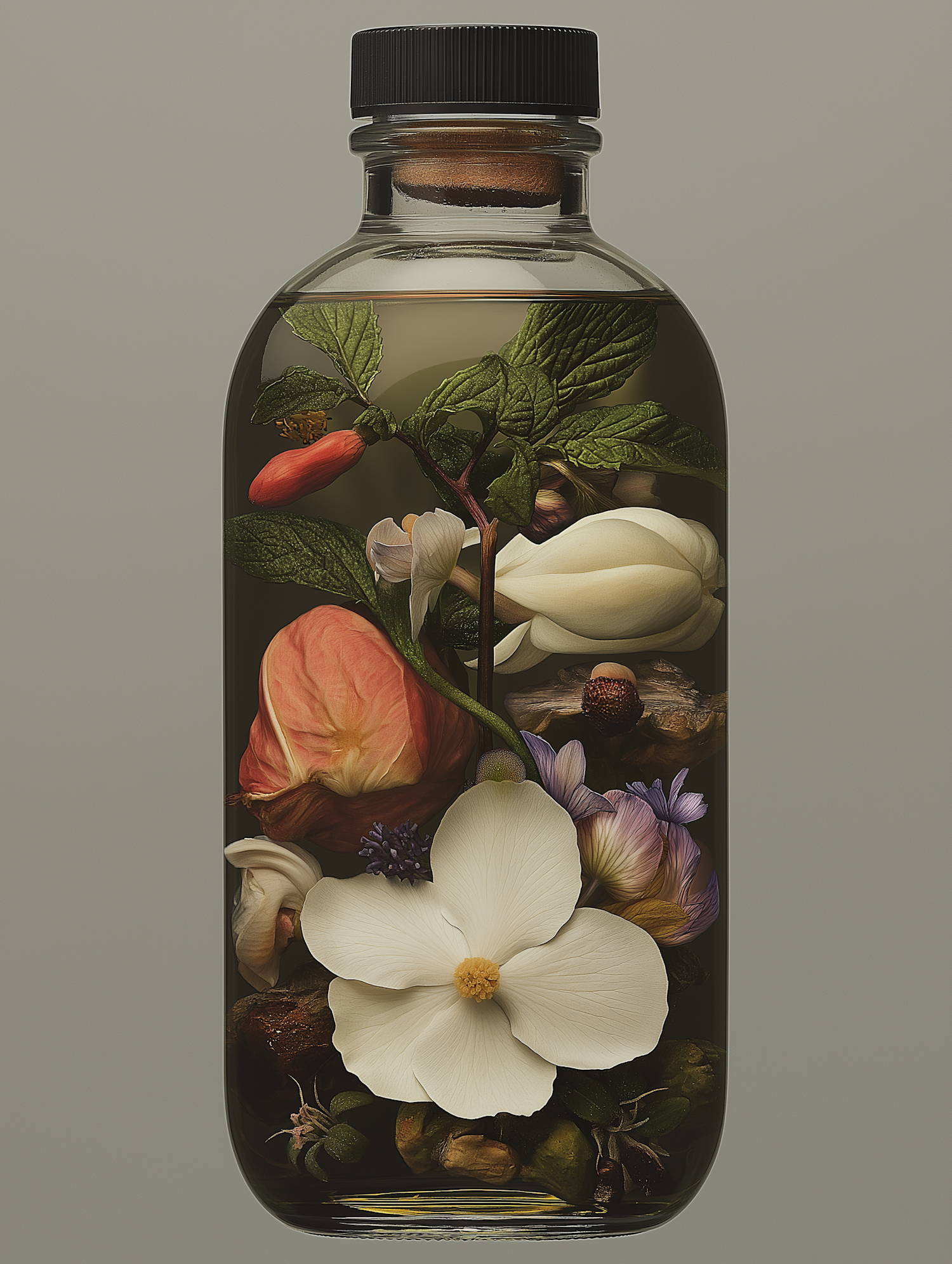 A glass bottle filled with vibrant flowers and leaves in clear liquid, creating a striking and colorful arrangement.