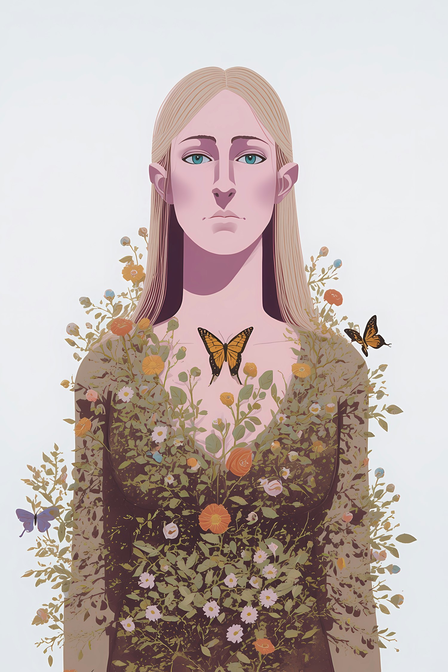 A stylized illustration of a person with blonde hair, surrounded by flowers and butterflies, blending nature and human elements beautifully.