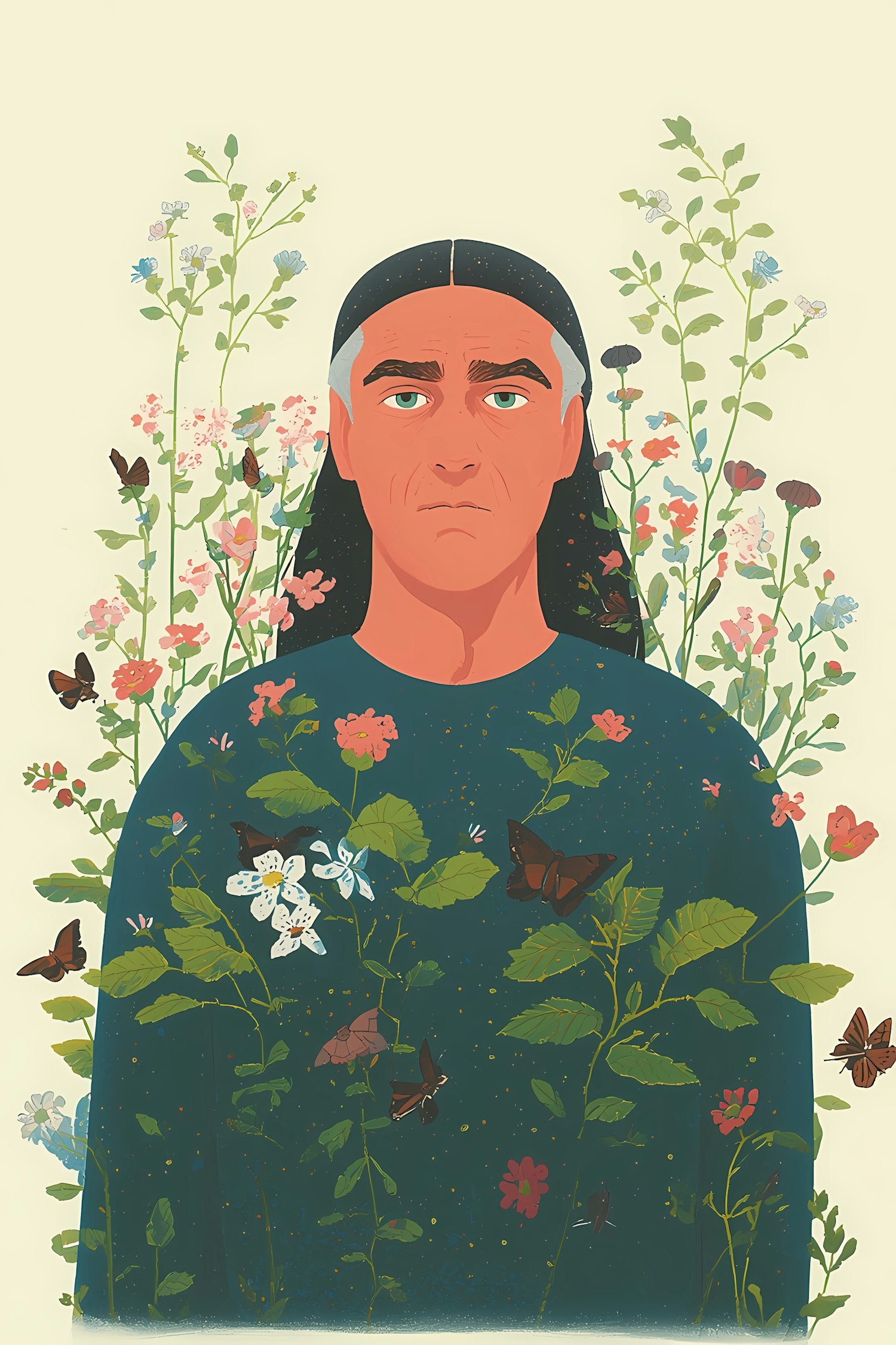 A vibrant illustration of a person surrounded by flowers and butterflies, blending nature and human elements in a harmonious design.