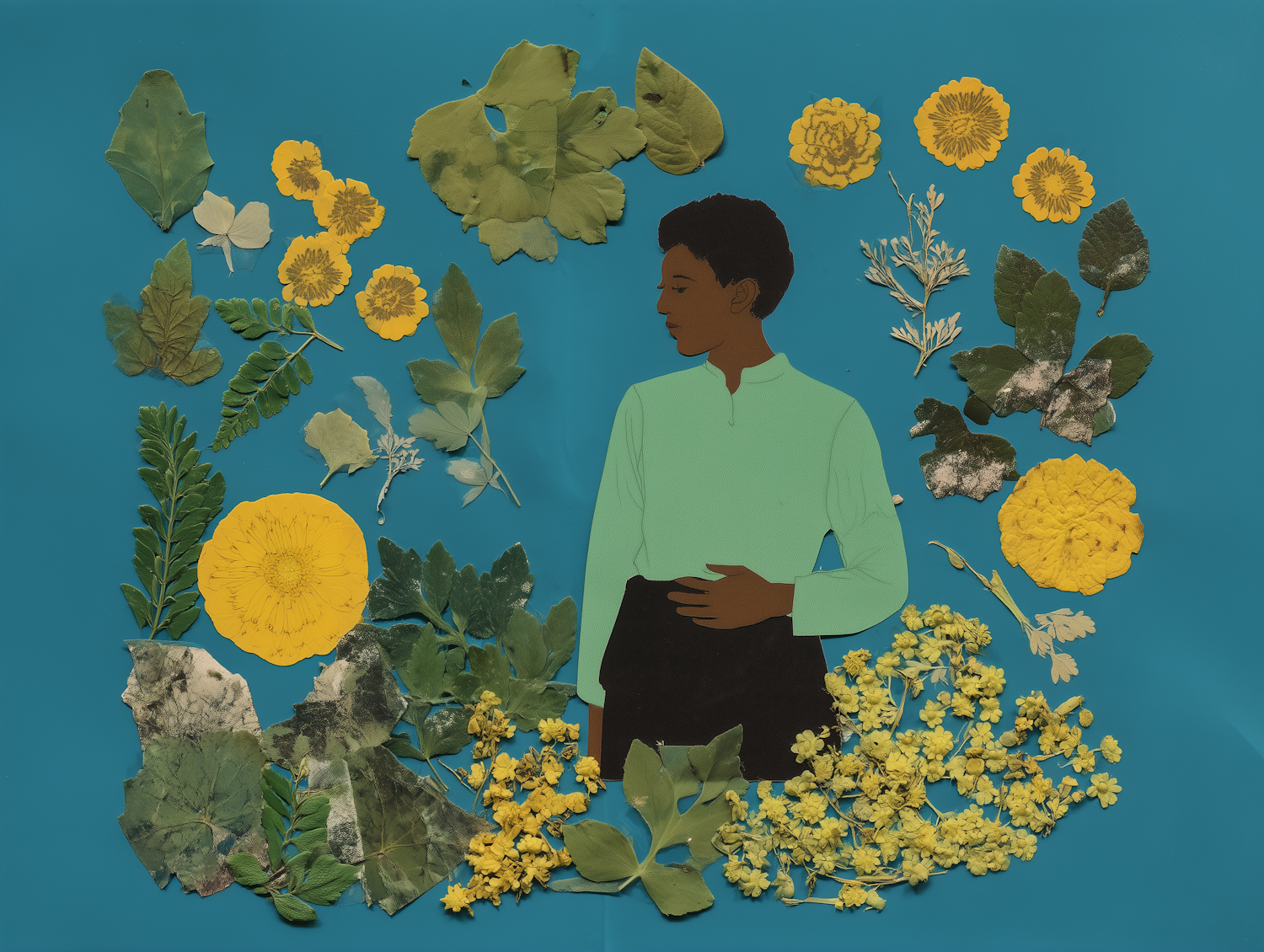 A colorful illustration of a person surrounded by yellow flowers and green leaves on a teal background, radiating natural beauty.
