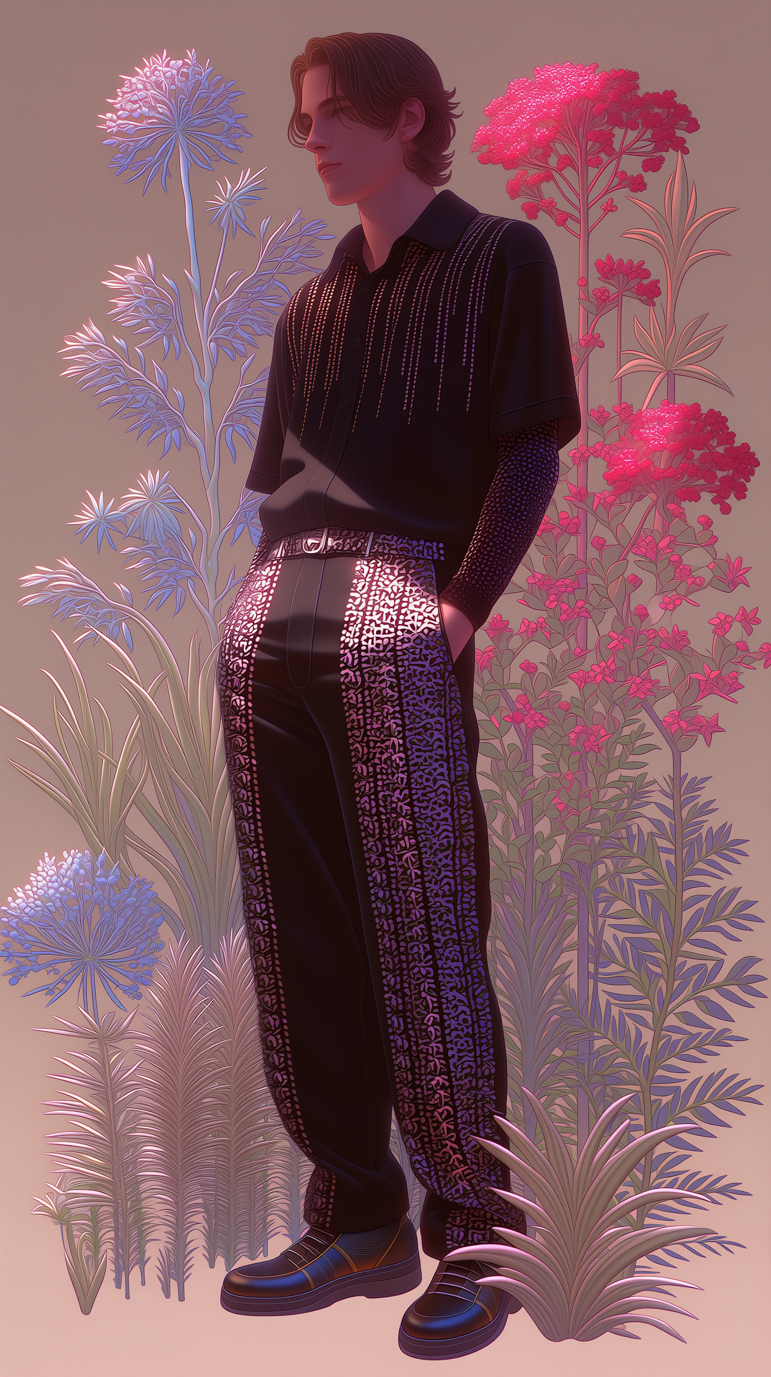 Stylized illustration of a person in patterned attire surrounded by vibrant, surreal flowers in pink and blue hues.