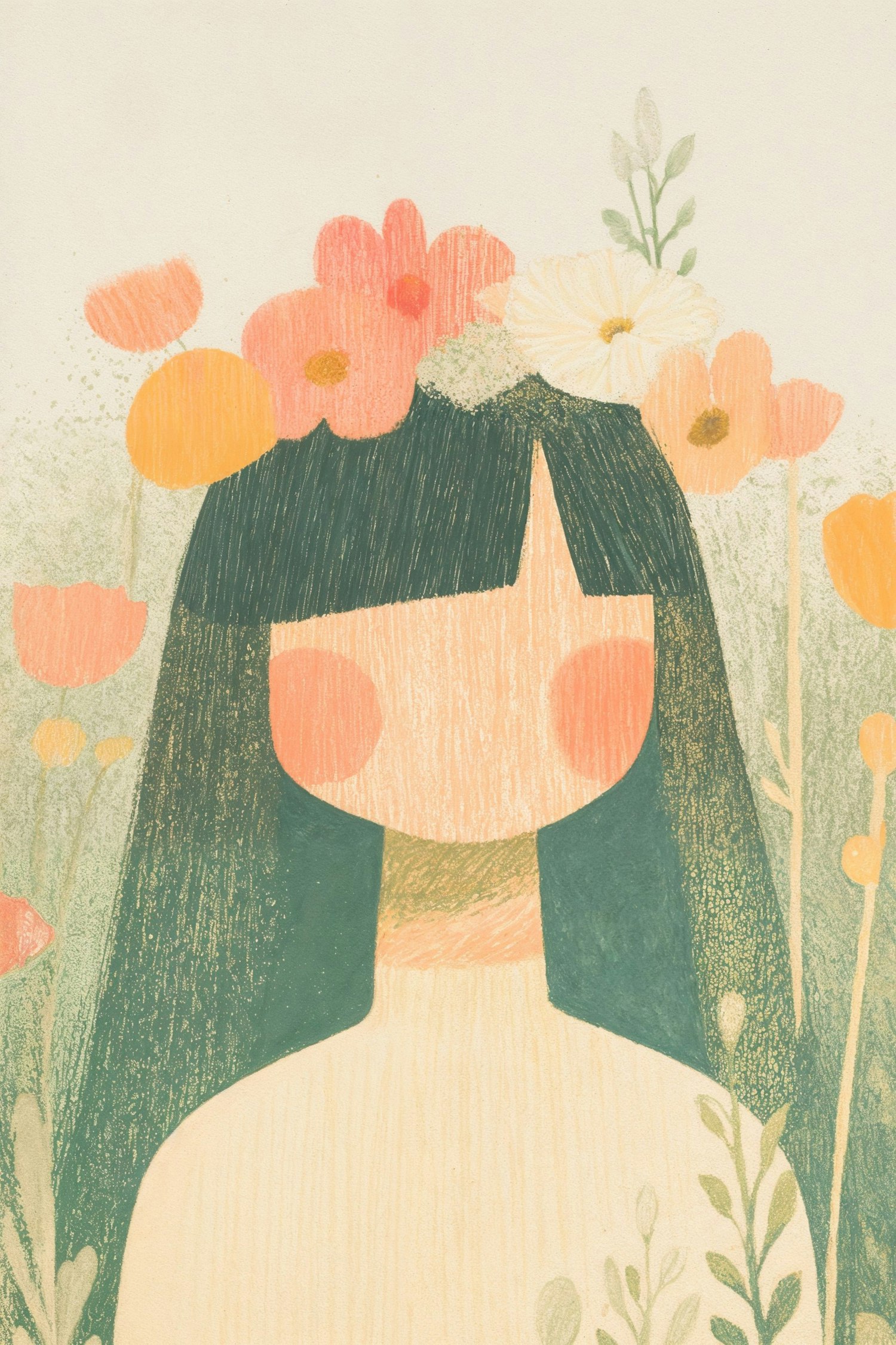 Whimsical illustration of a person with dark hair and floral crown, surrounded by pastel flowers and foliage.