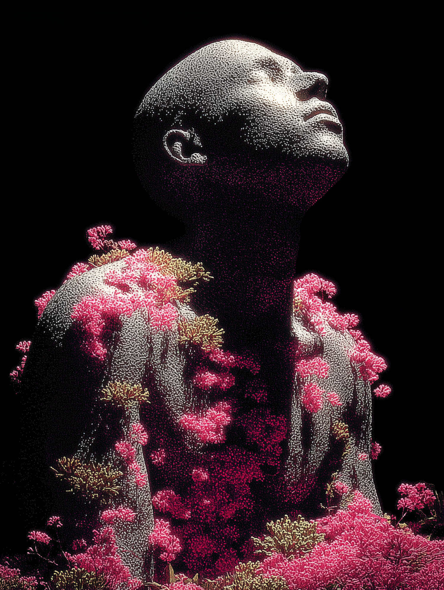 A surreal digital artwork of a textured human figure intertwined with vibrant pink flowers against a black background.