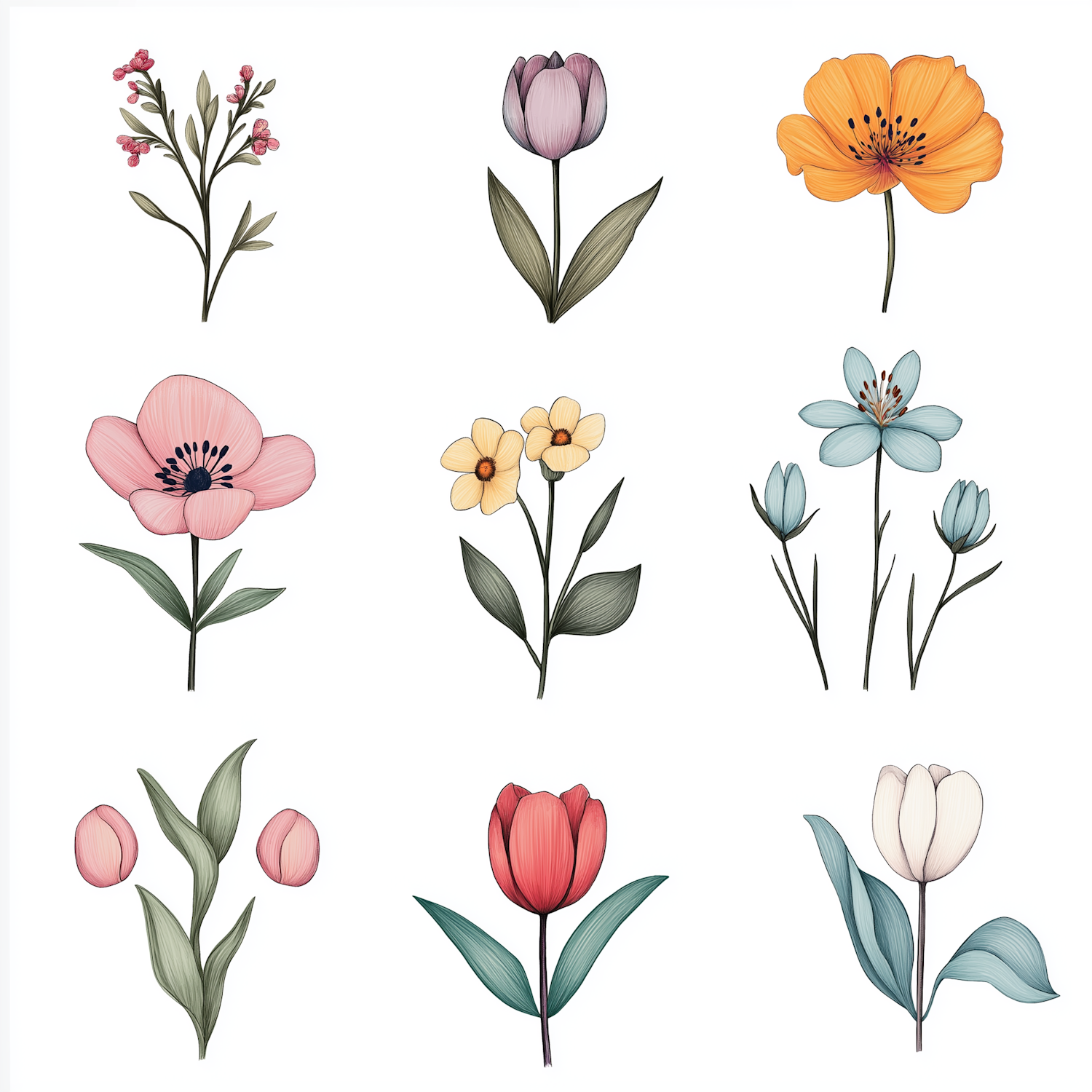Beautiful hand-drawn floral illustrations featuring tulips, poppies, and more in soft pastel tones on a white background.
