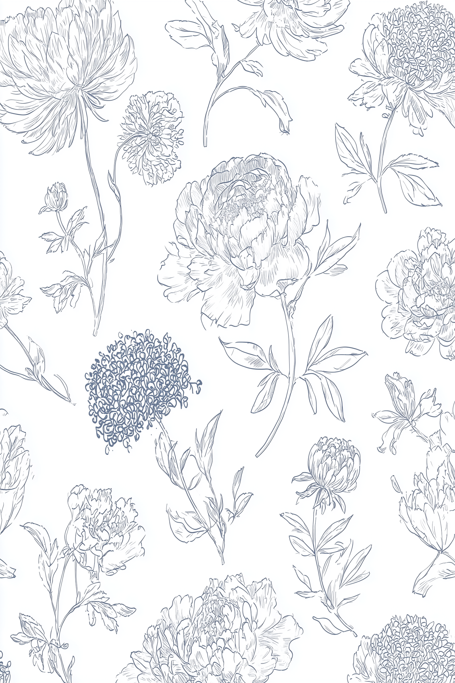 Elegant blue line art floral pattern with peonies and leaves on a white background, perfect for wallpapers or textile designs.