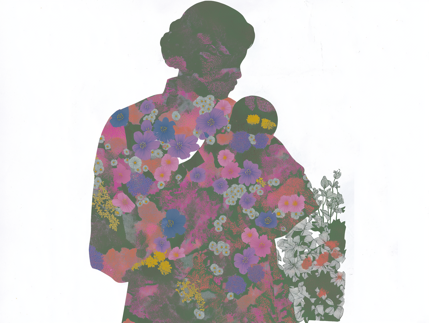 A silhouette of a woman holding a baby filled with vibrant floral patterns, blending human forms with nature in a tender, artistic design.