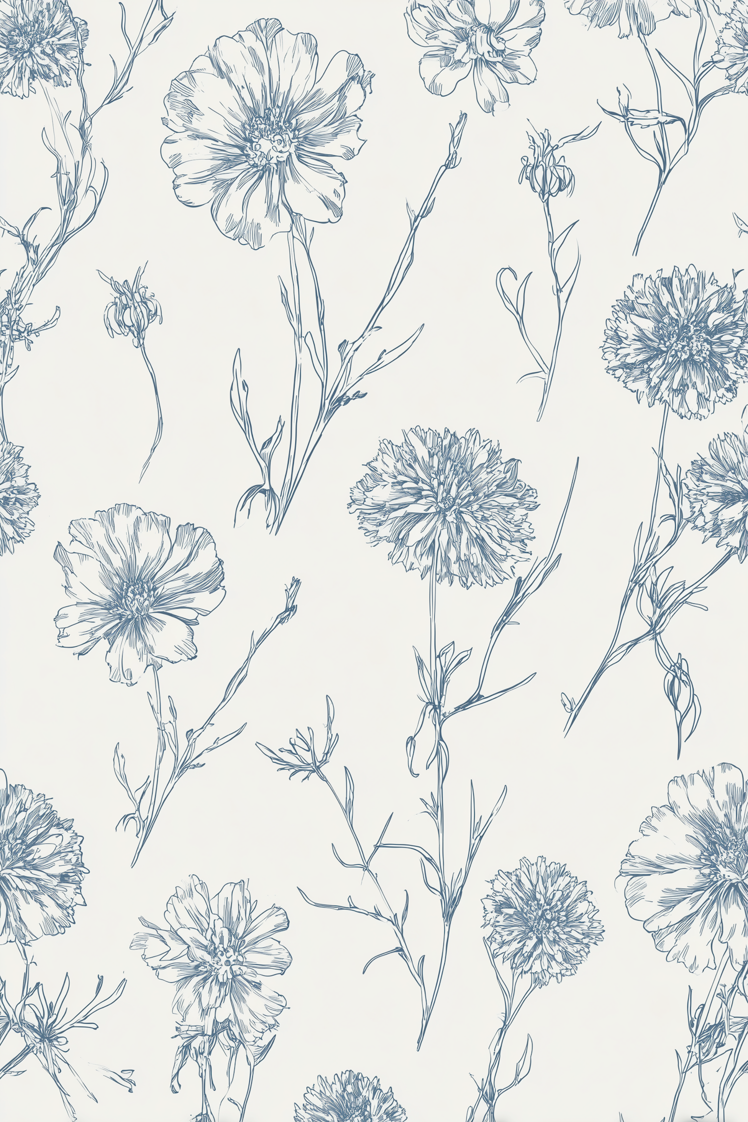 Elegant blue floral line art on a light background, perfect for wallpaper or textile designs with a delicate and natural aesthetic.