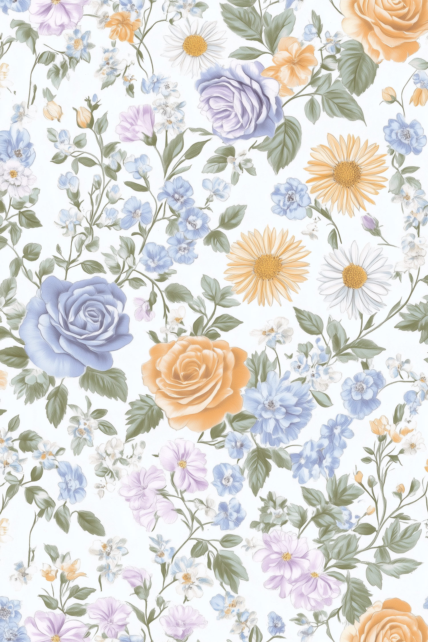 Elegant floral pattern with pastel roses, daisies, and lush green leaves on an off-white background, creating a vibrant design.