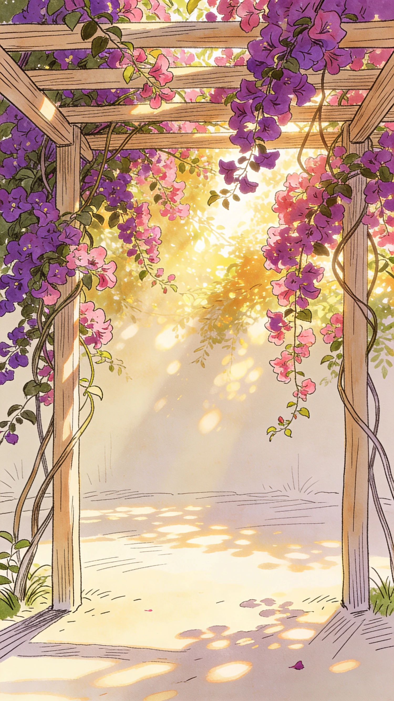 A pergola with purple and pink flowers under warm sunlight, creating a serene and inviting atmosphere with dappled light and shadows.