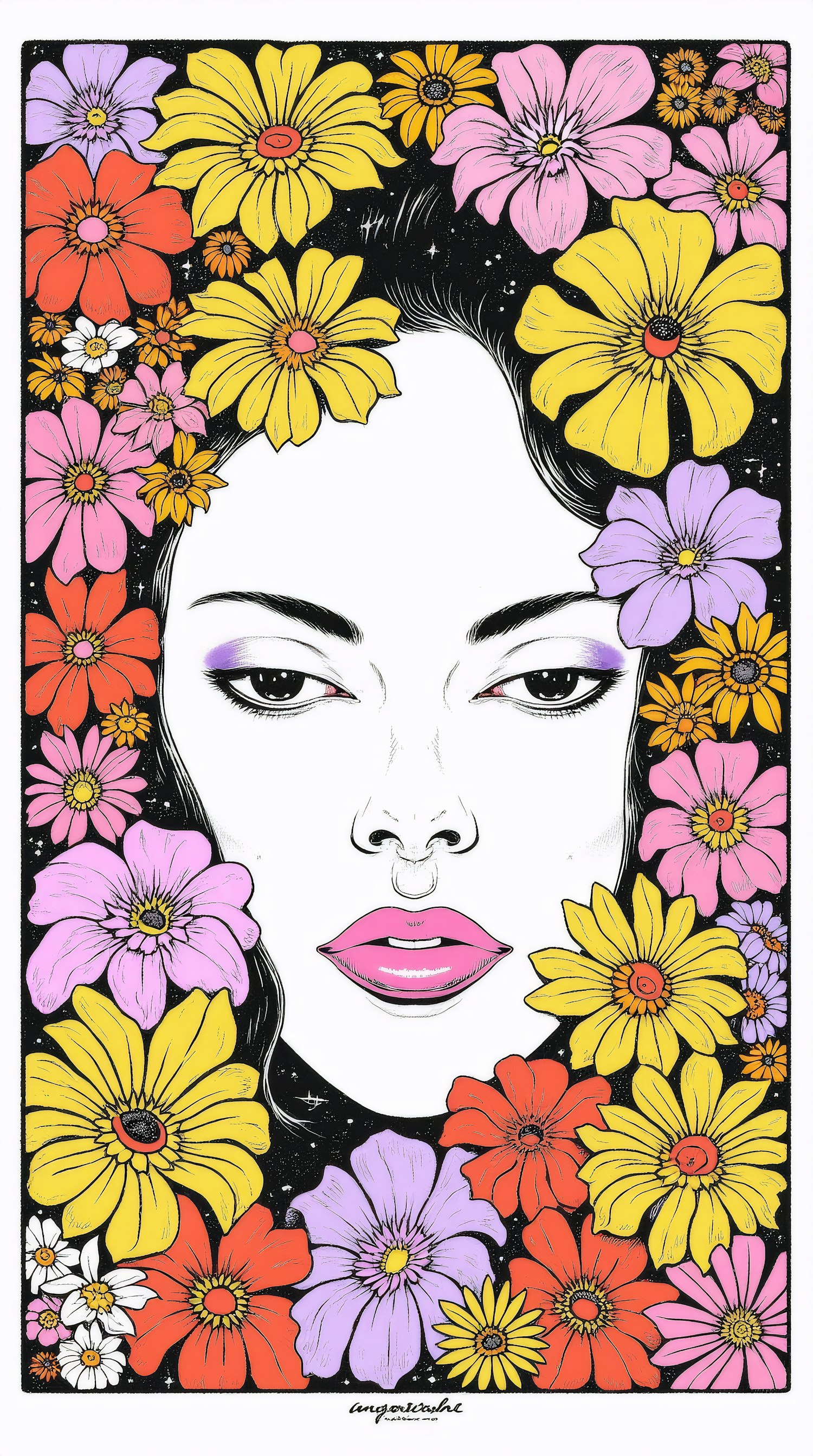 A stylized illustration of a woman's face surrounded by vibrant flowers in yellow, pink, and orange hues, set against a black background.