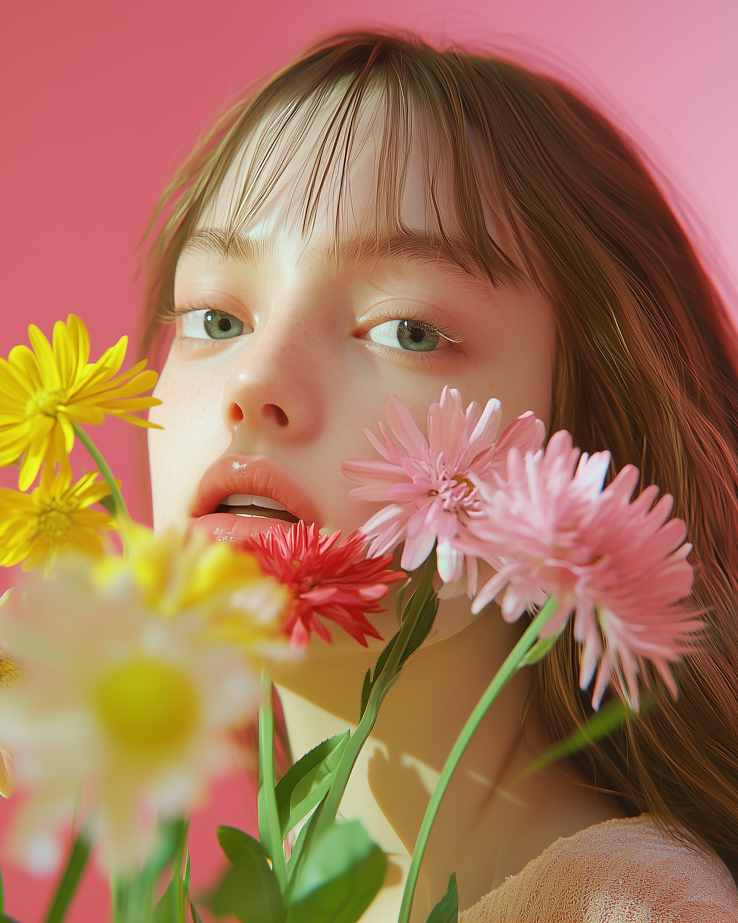 A serene portrait of a young woman surrounded by vibrant daisies against a soft pink background, exuding freshness and natural beauty.