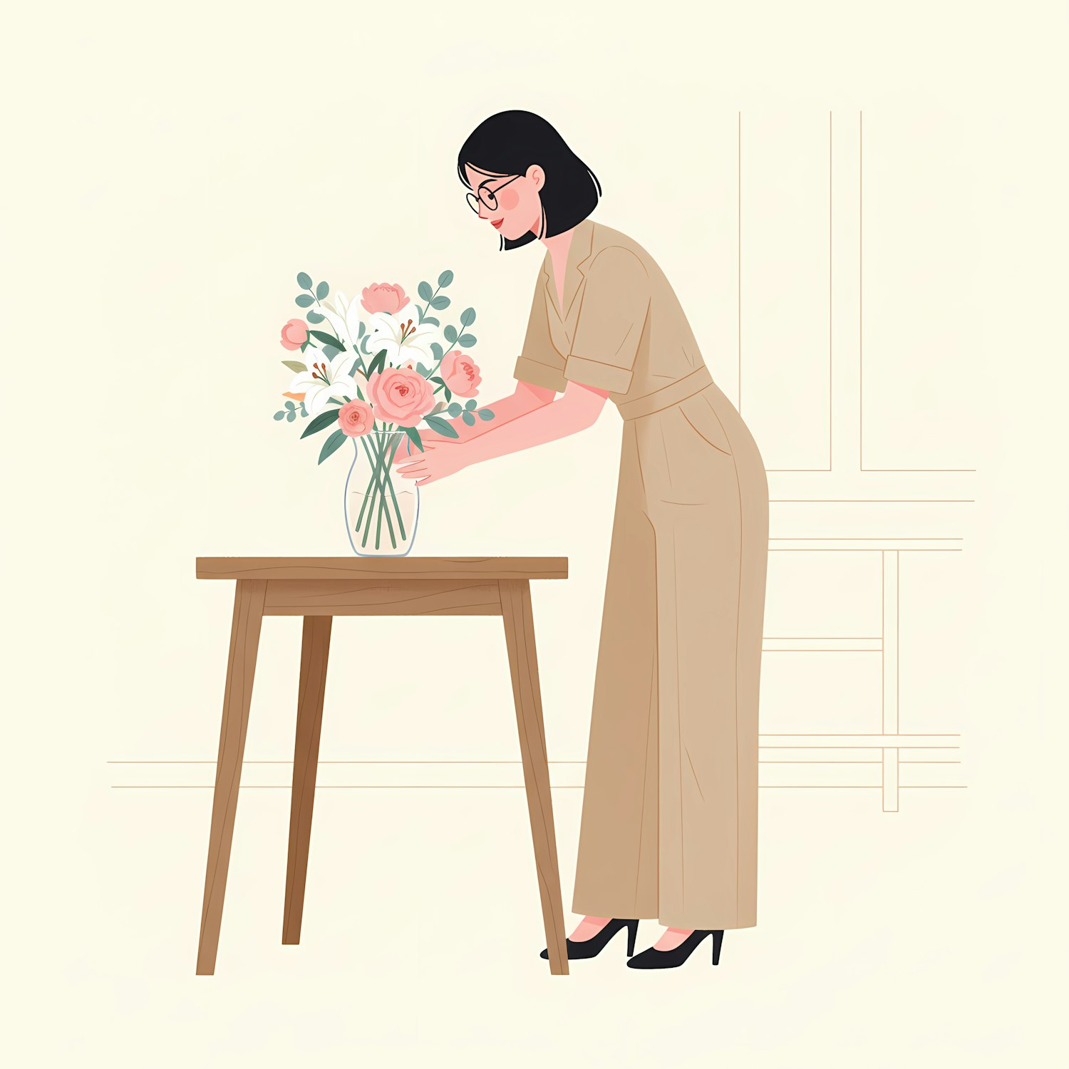 Illustration of a woman arranging a flower bouquet in a vase on a wooden table, wearing a beige jumpsuit and glasses.