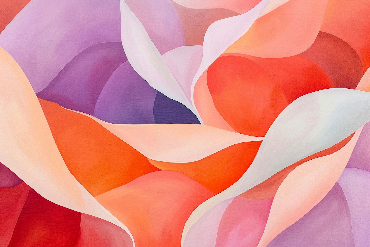 Abstract flowing shapes in vibrant reds, oranges, purples, and whites blend harmoniously, evoking movement and fluidity.
