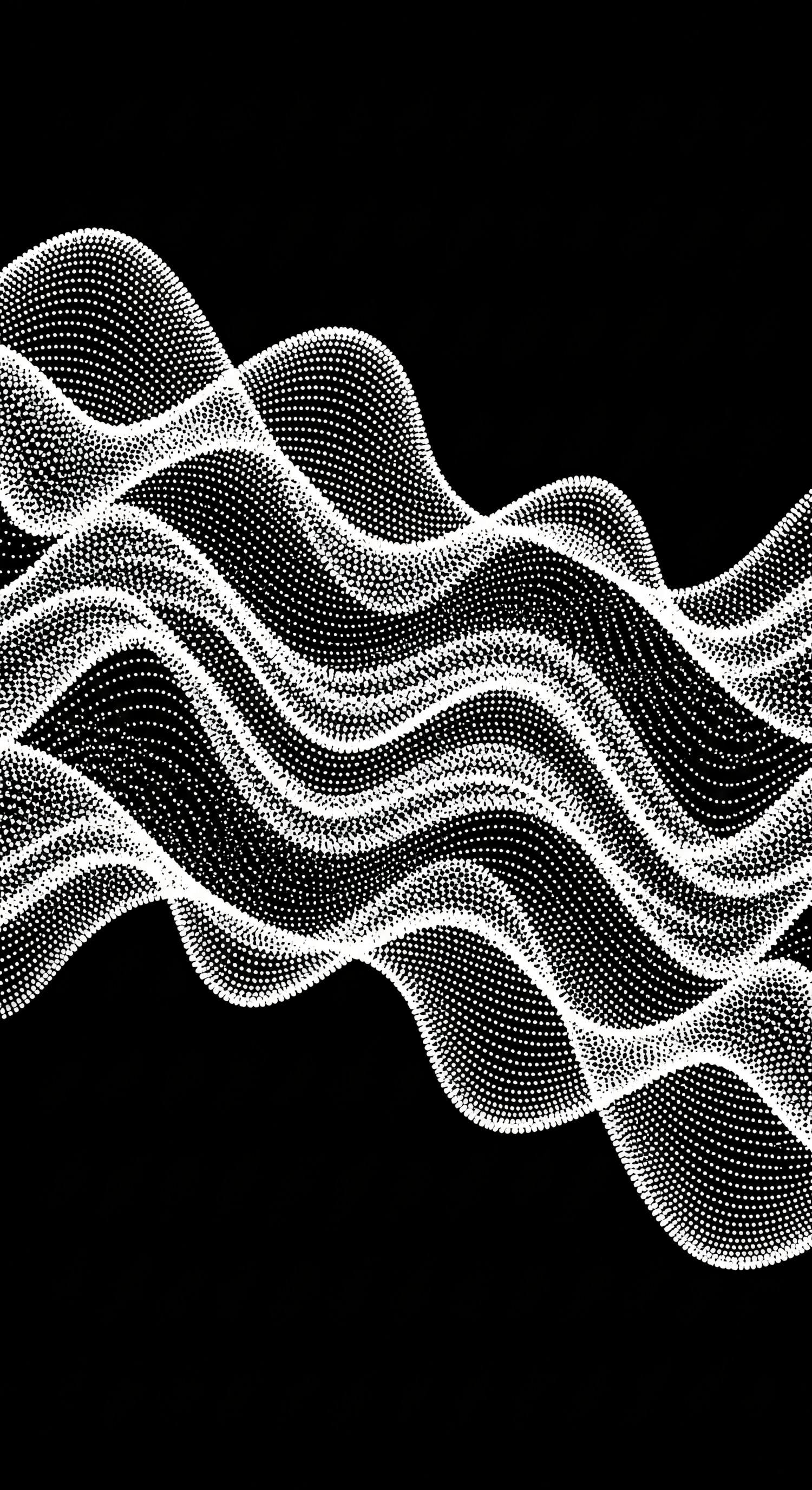 Abstract digital art of white dotted waves on a black background, creating a sense of motion and depth.