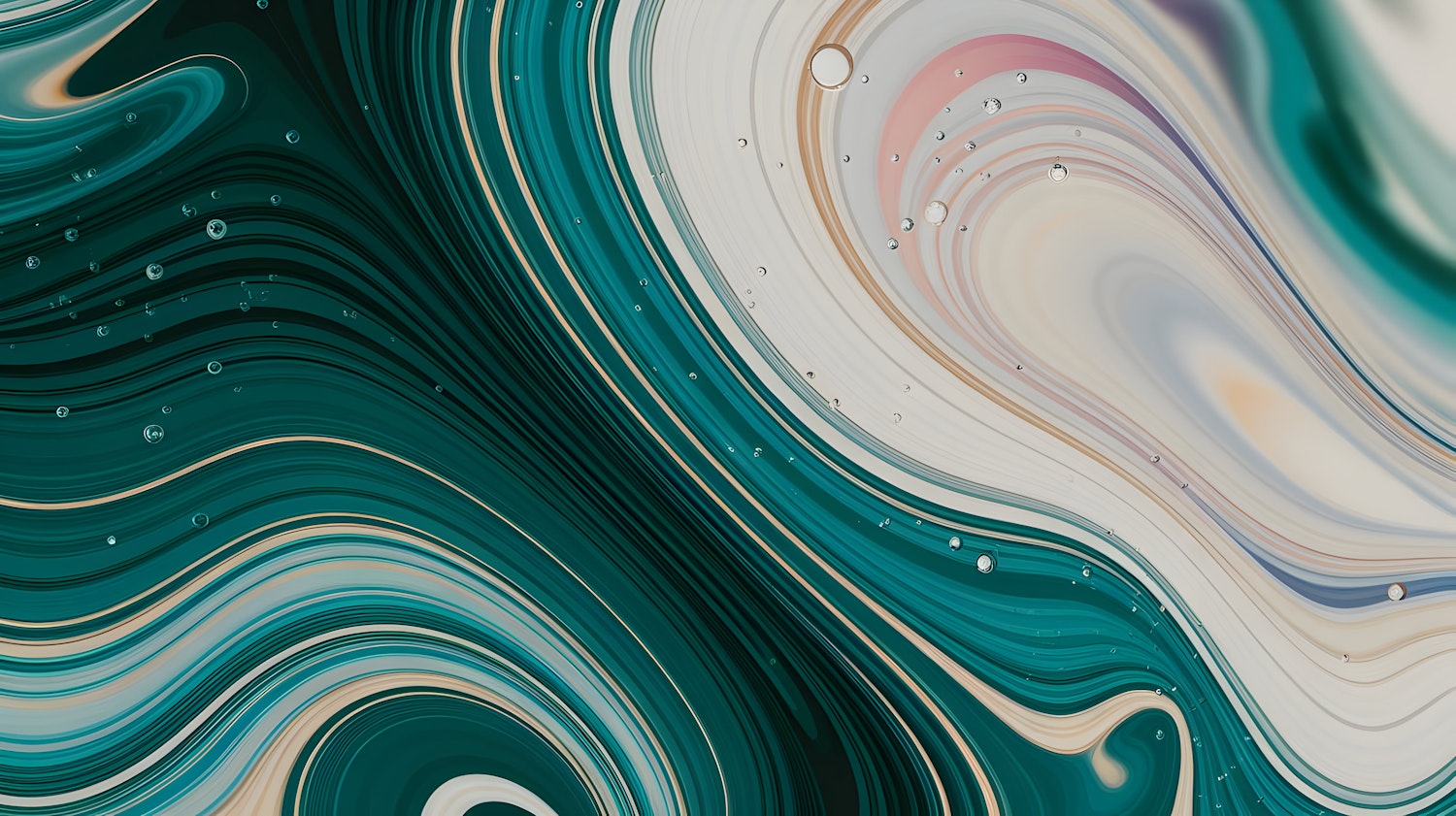 Abstract swirls of teal, cream, and beige with scattered droplets, creating a dynamic and calming fluid art composition.