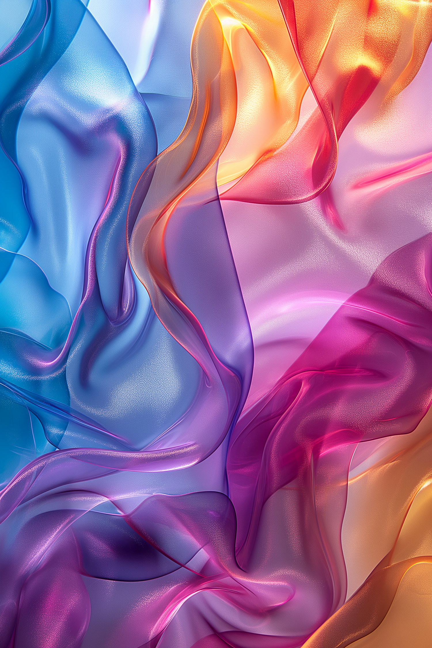 Abstract waves of vibrant blues, purples, pinks, and oranges create a fluid, ethereal composition with a glossy, translucent texture.