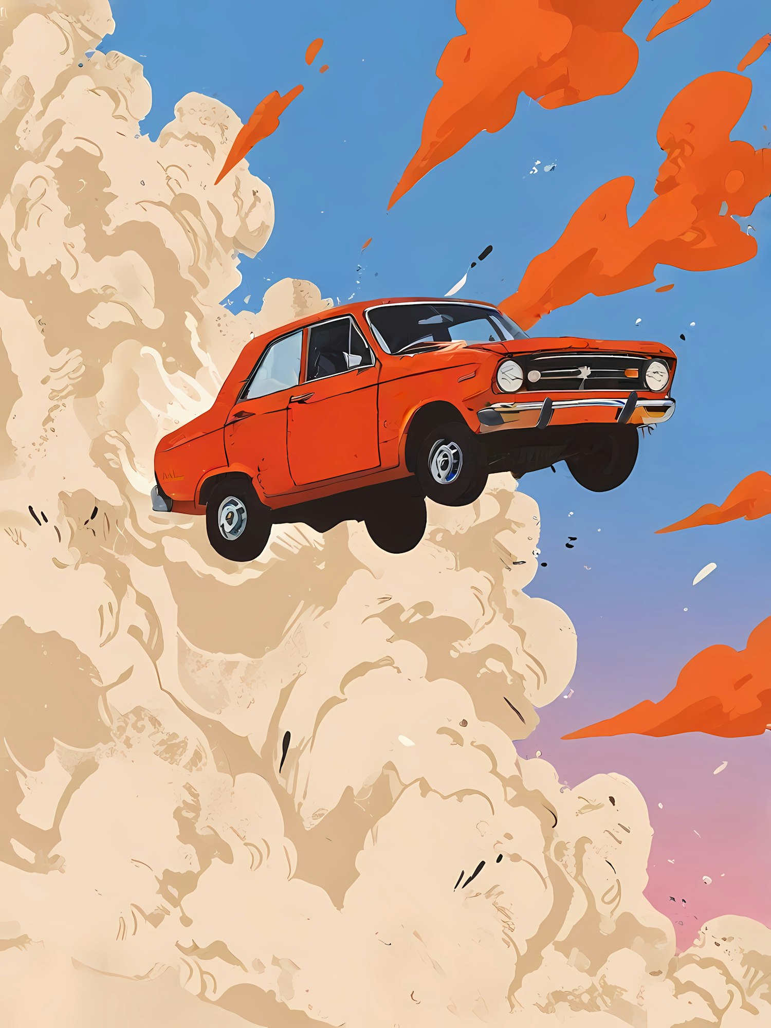 Dynamic illustration of a vintage orange car flying through clouds with vibrant orange streaks against a blue and pink sky.