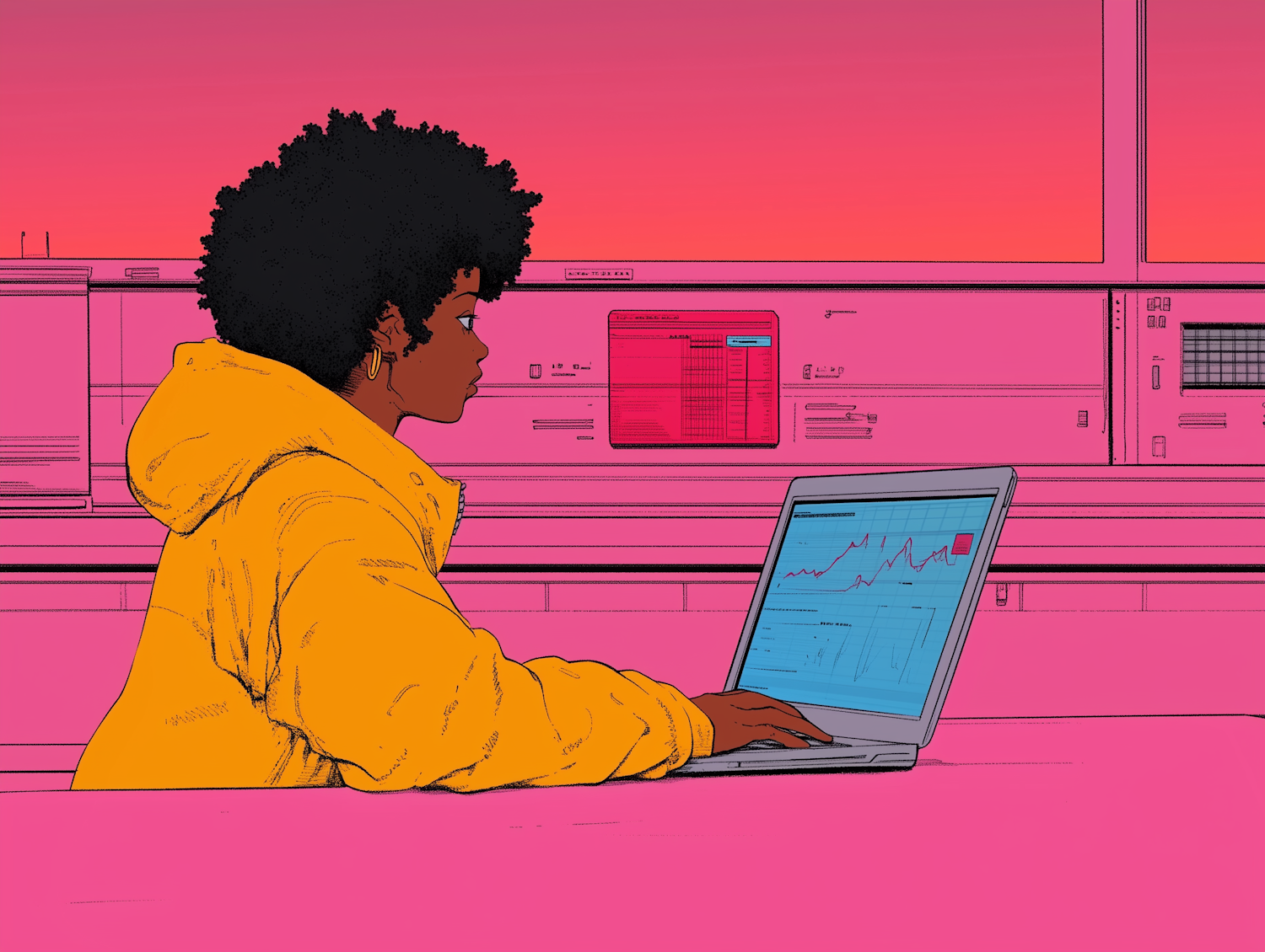 A woman in a yellow jacket analyzes data on a laptop in a vibrant pink tech setting, highlighting a modern and futuristic theme.