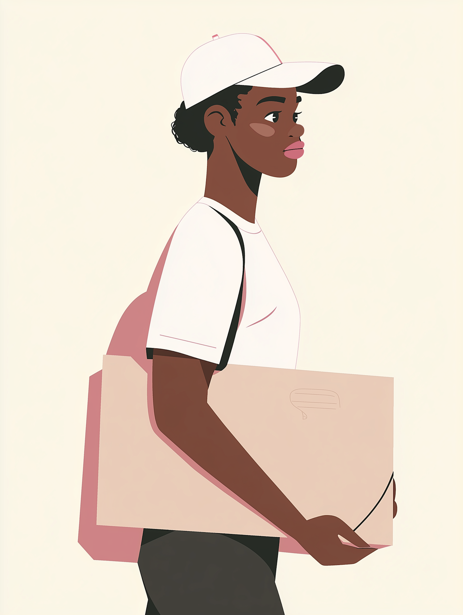 Stylized illustration of a young Black woman in a cap carrying a cardboard box, set against a light beige background.