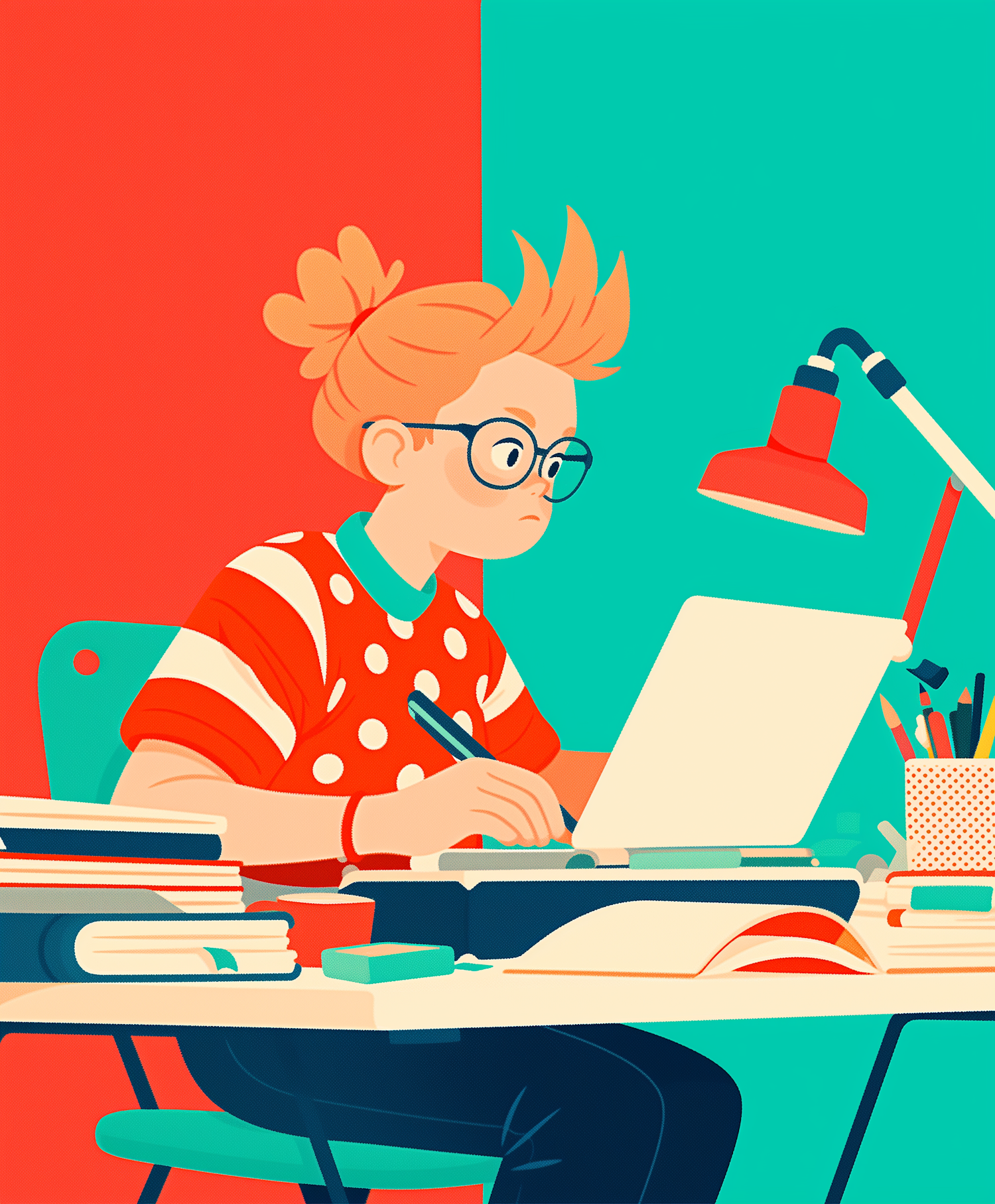 Illustration of a focused person working at a cluttered desk with books and a laptop, set against a vibrant red and teal background.