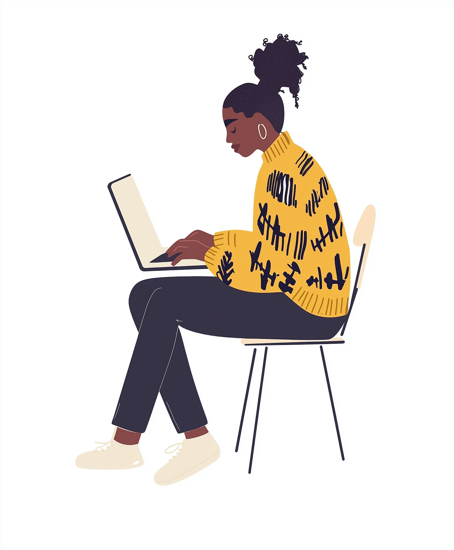 Illustration of a young Black woman in a yellow sweater working on a laptop, sitting on a chair with a plain white background.