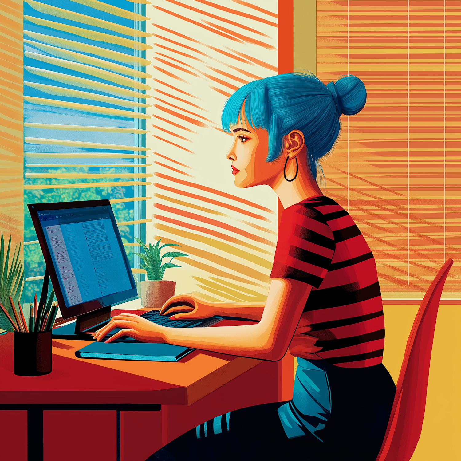Illustration of a woman with blue hair working at a computer in a sunlit room, featuring striped shadows and a modern desk setup.