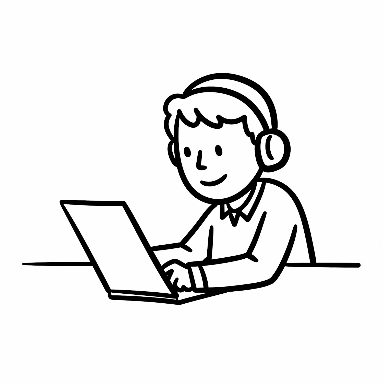 A simple black-and-white illustration of a person using a laptop while wearing headphones, conveying focus and engagement.