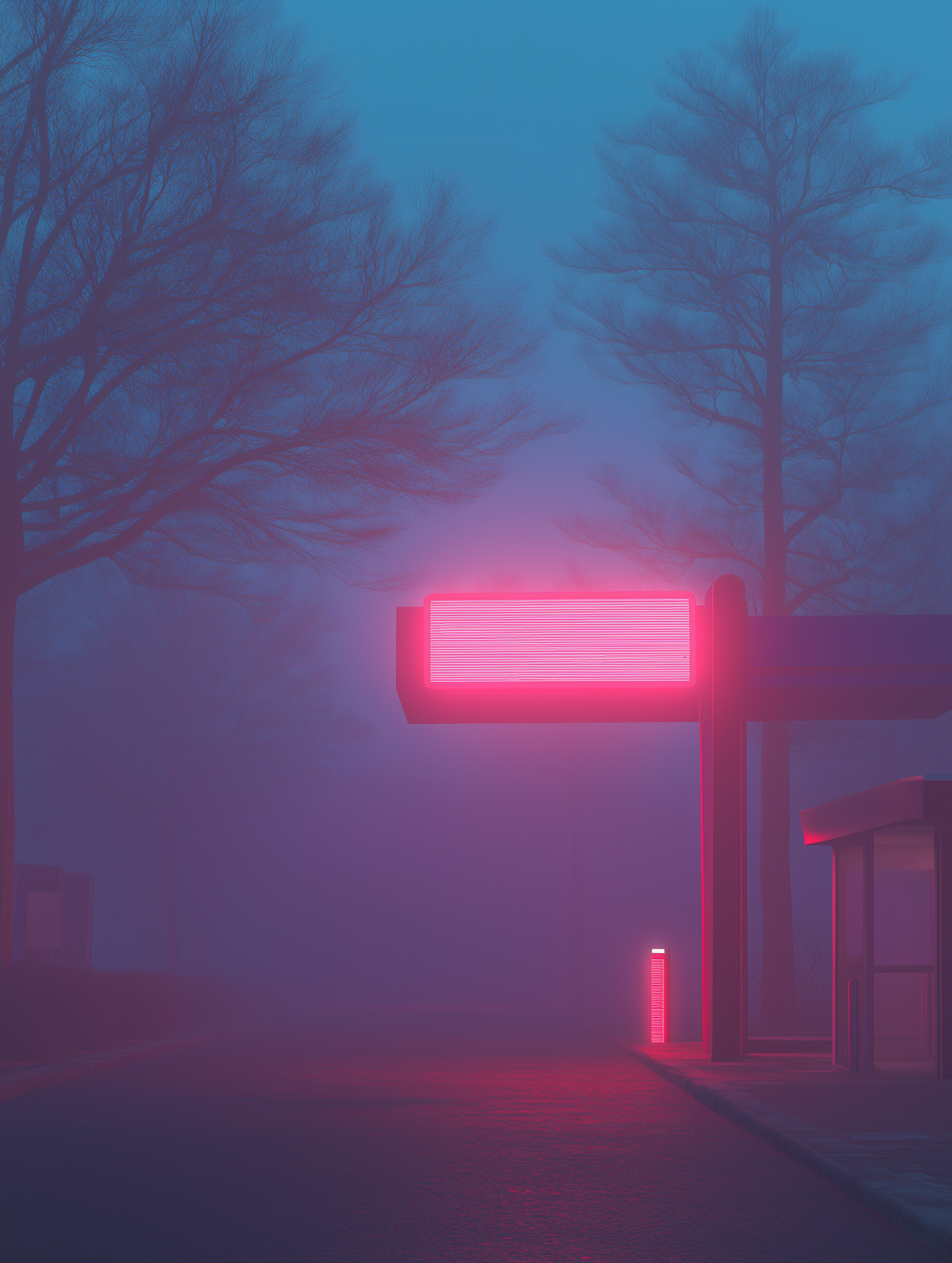 Misty scene with neon pink sign glowing in fog, surrounded by silhouetted trees. Eerie and atmospheric with a dreamlike quality.