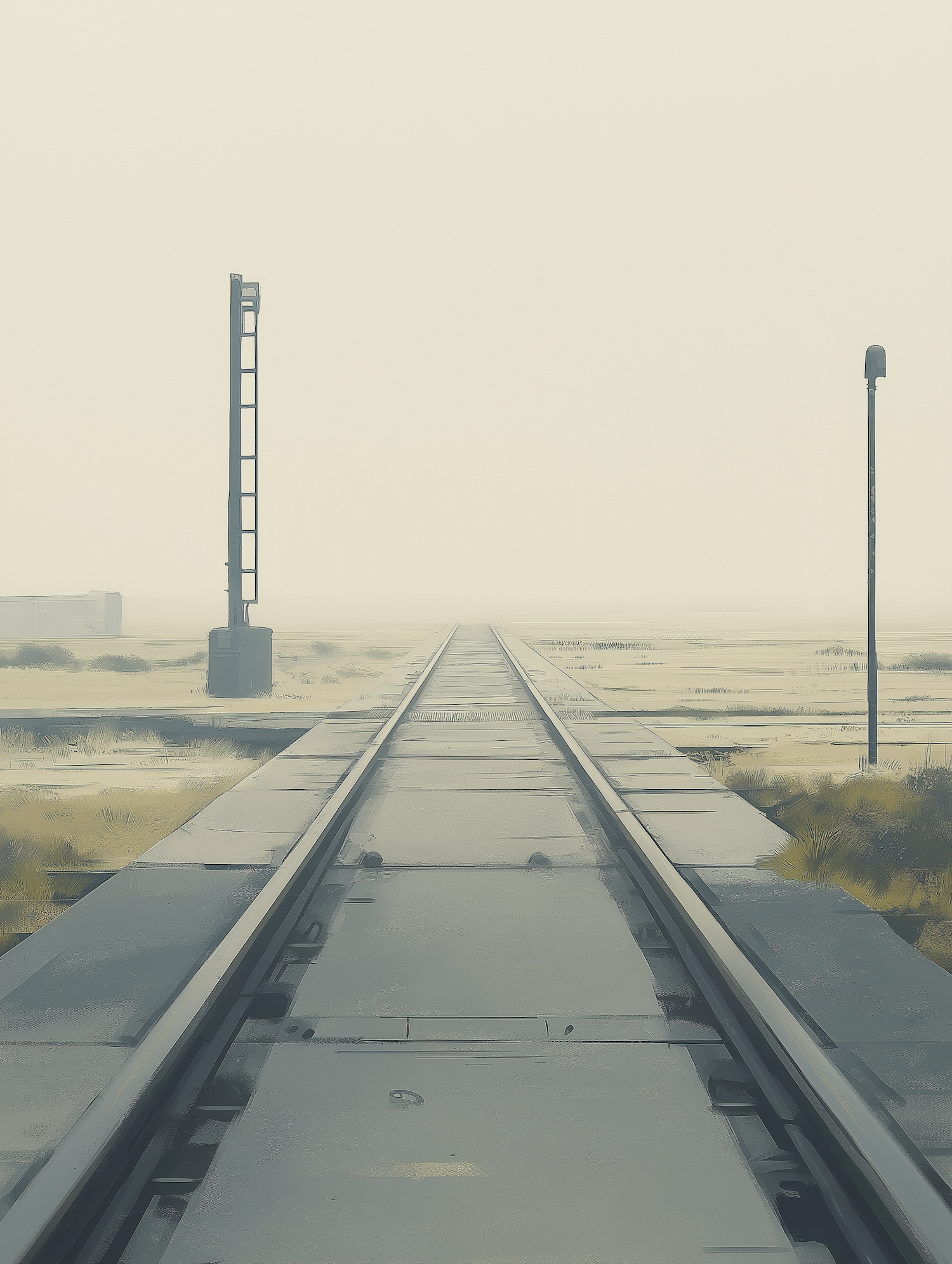 Minimalist railway track scene with signal poles and sparse vegetation under an overcast sky.