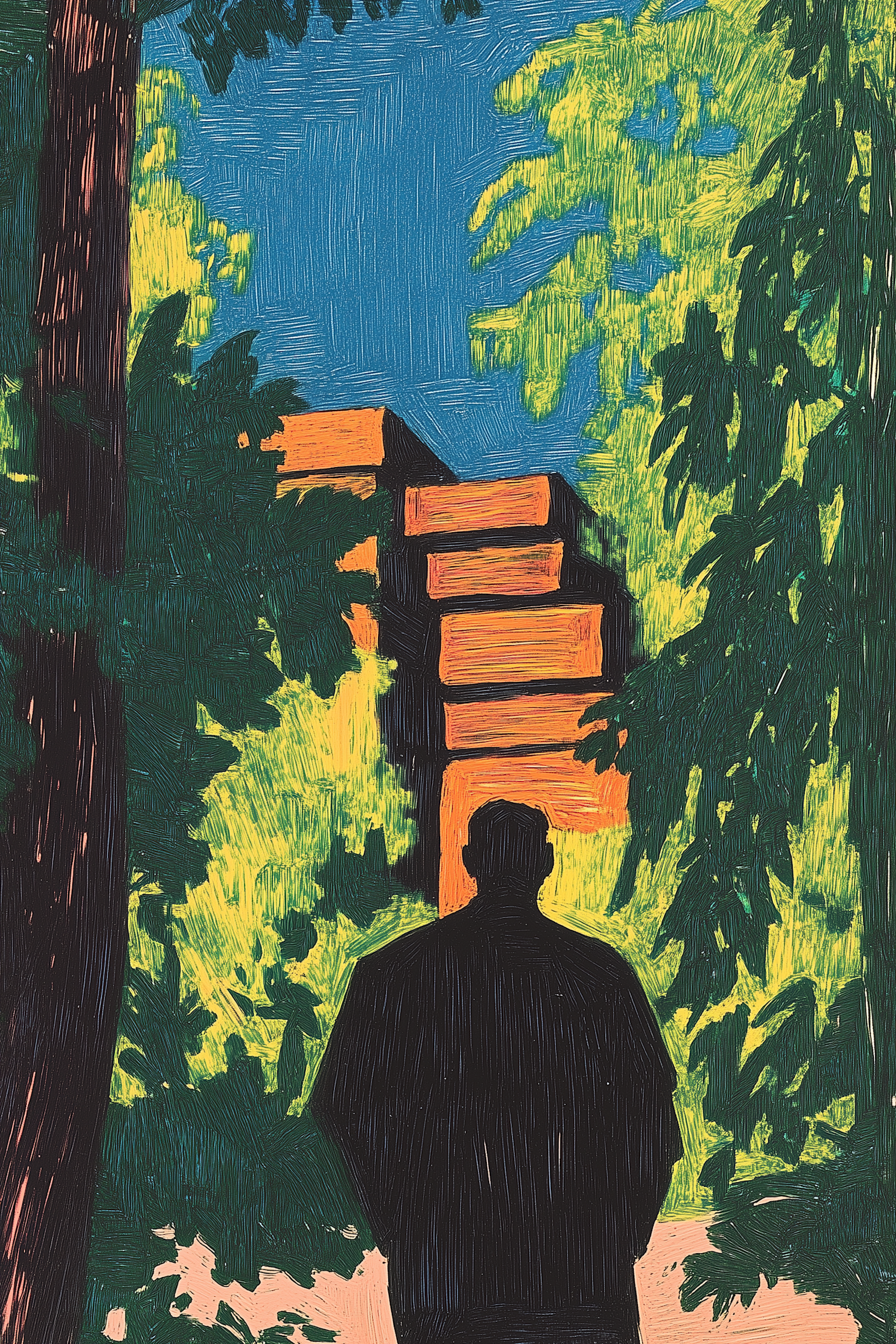 A vibrant illustration of a silhouette in a forest with a bold orange structure in the background, set against a vivid blue sky.