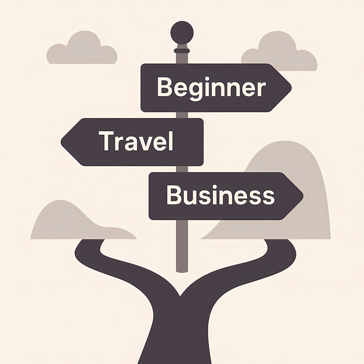 Minimalist signpost illustration with arrows labeled Beginner, Travel, and Business, set against a neutral background with abstract hills.
