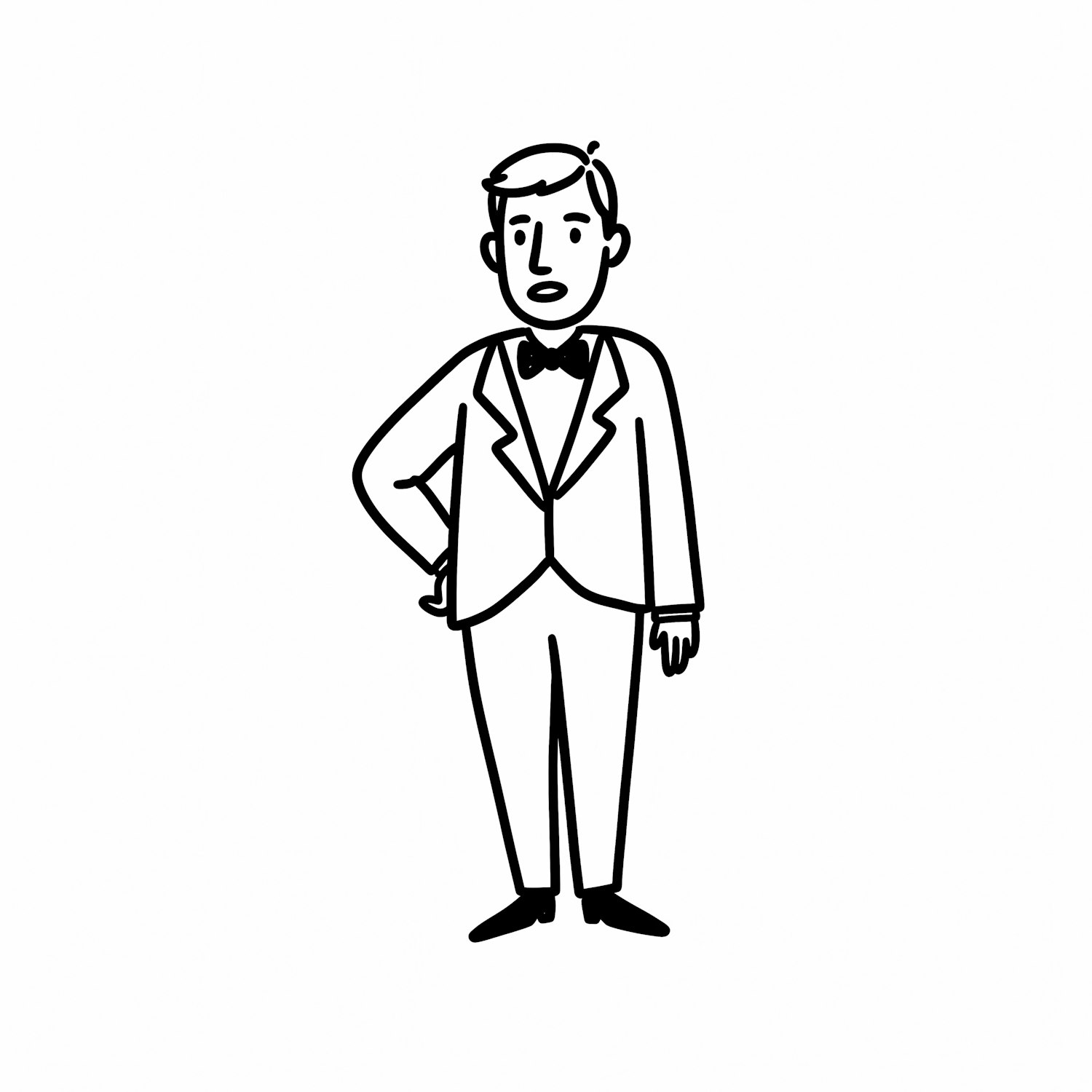 Cartoon illustration of a man in a formal suit with a bow tie, standing with one hand on his hip. Simple black-and-white line art.