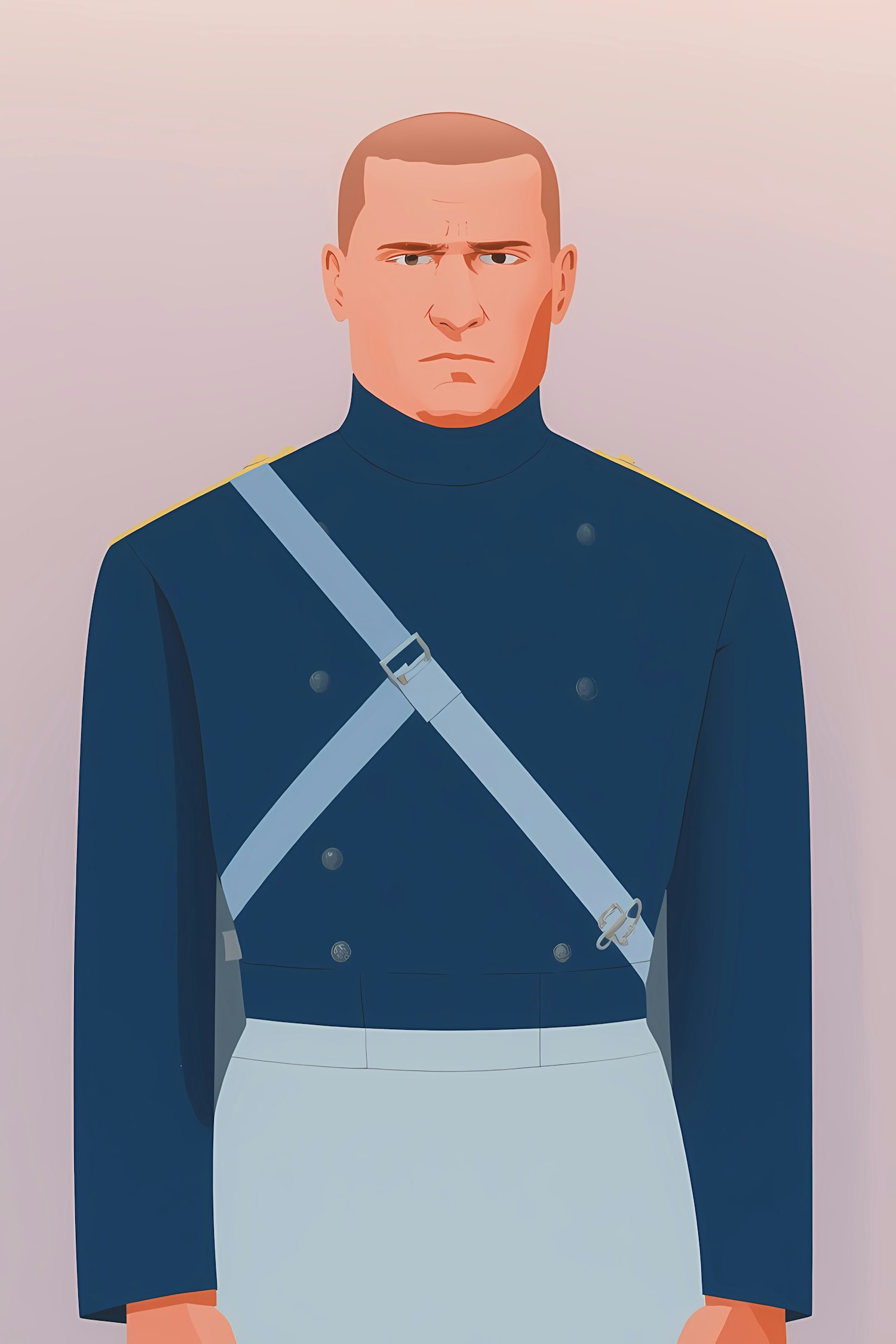 Illustration of a person in a formal dark blue uniform with light blue straps, set against a soft pastel gradient background.