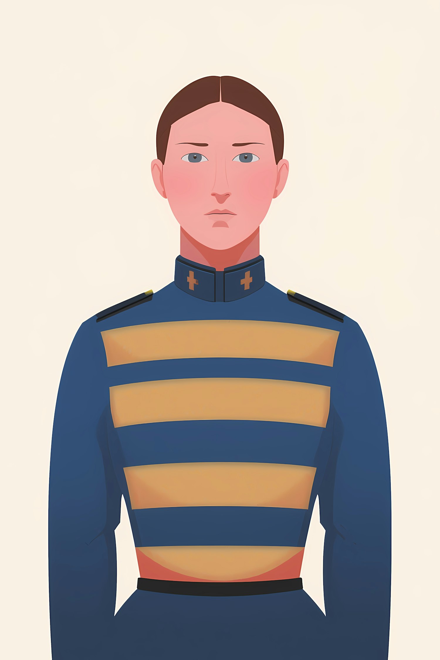 Illustration of a person in a blue and gold uniform with a clean, minimalistic style and a light beige background.